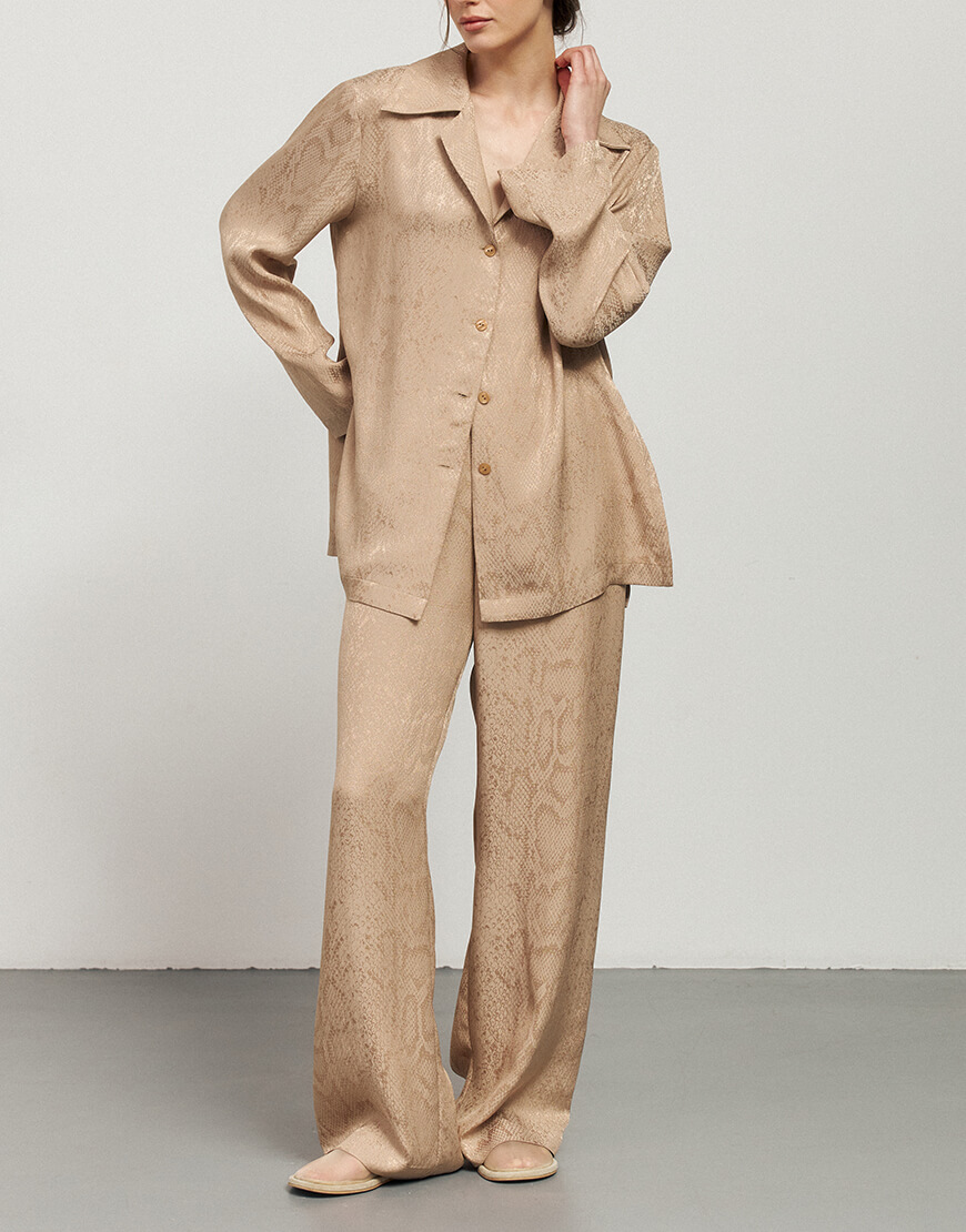 Бежеві атласні штани з анімалістічнім прінтом на резинці та з кішенямі з обох боків. Ідельно поєднується з чорною сорочкою вільного крою з анімалістичним принтом