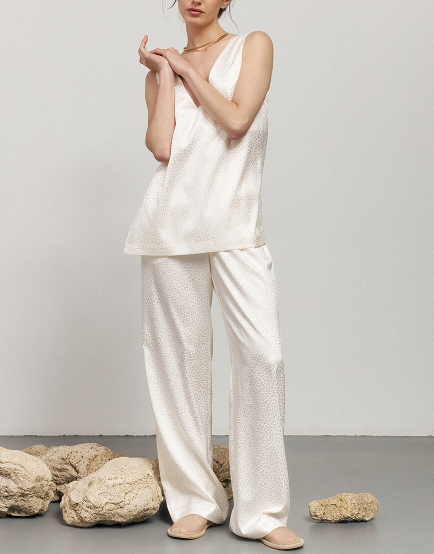 Прямі молочні брюки з атласу та резинкою на поясі. Наявні дві прорізні кишені з боків. Ідеальним доповненням стане атласний молочний топ з леопардовим принтом.