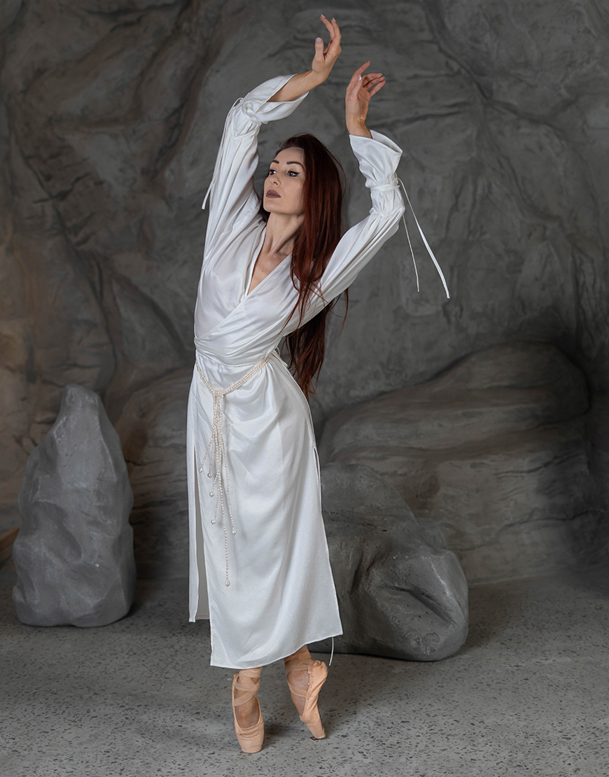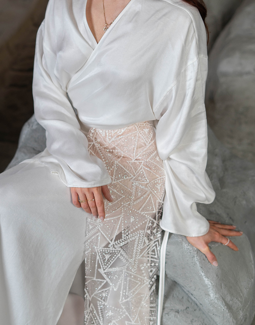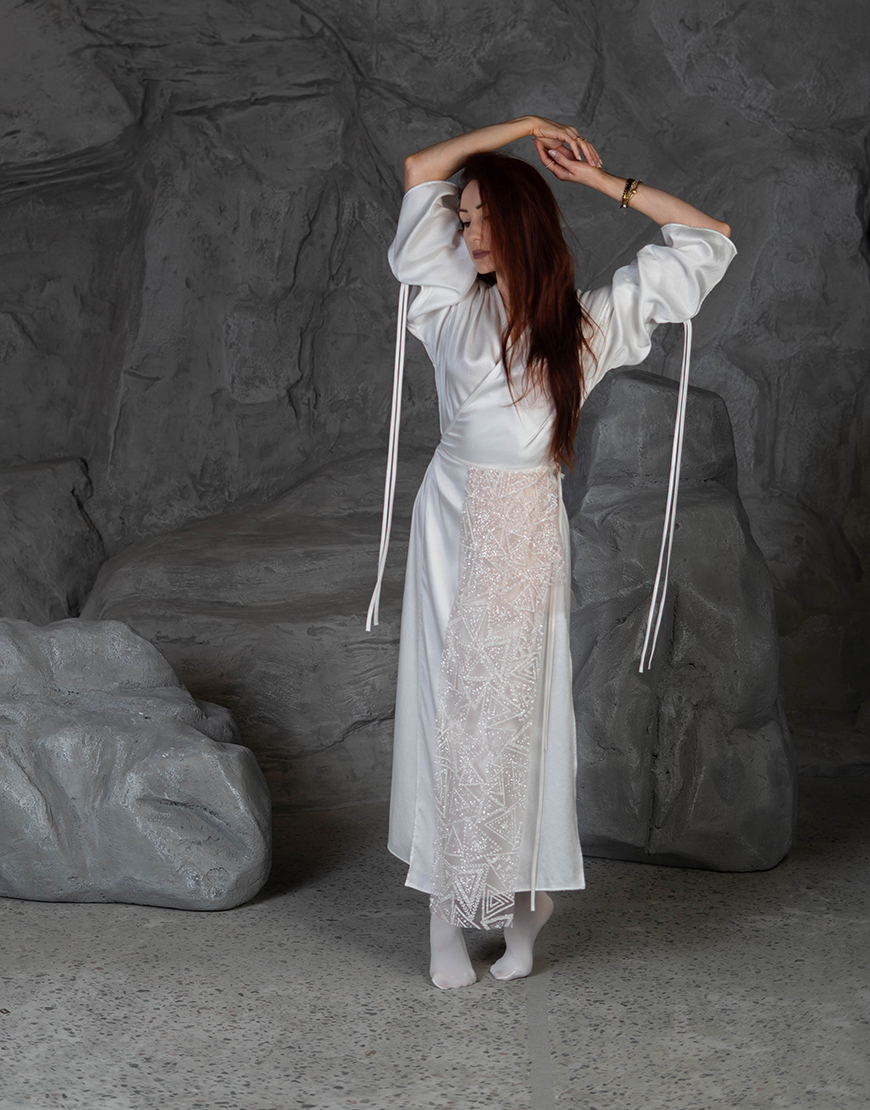 Ідеально підходить на ранок підготовки до весілля, або для самої урочистості. Зав’язки на рукавах і на поясі дозволять обіграти вбрання відповідно до випадку та настрою.