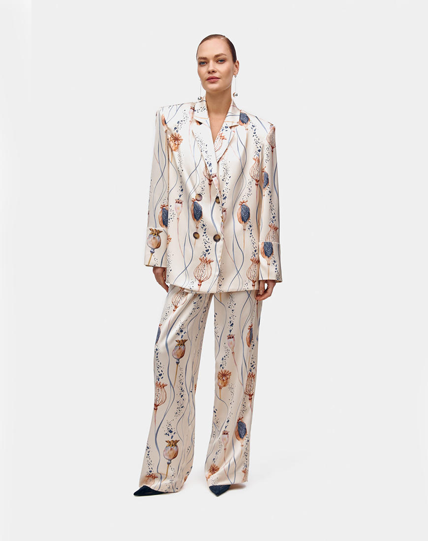 Доставка від 14 днівКостюм з м’якої, шовковистої тканини, який складається з подовженої сорочки вільного крою та широких штанів на резинці. Авторський принт було розроблено для нашого різдвяного Special Drop. В його основі лежить образ головки маку, який у багатьох культурах символізує спокій, мрії та пам’ять. Для різдвяної лінії ми переосмислили цей символ, перетворивши його на втілення загадковості зимової ночі та святкової обіцянки. Родзинкою костюма є акцентний комірець та манжети. Кожен костюм матиме свій унікальний принт, адже, розташування малюнку відрізнятиметься у кожному окремому випадку.