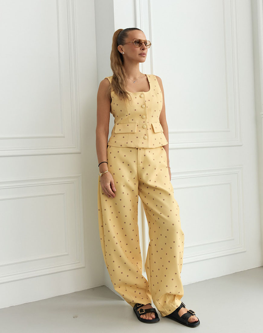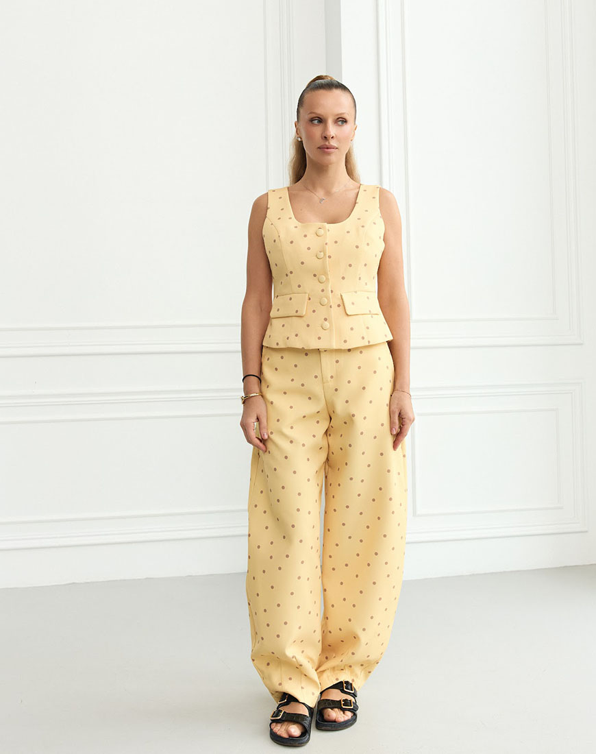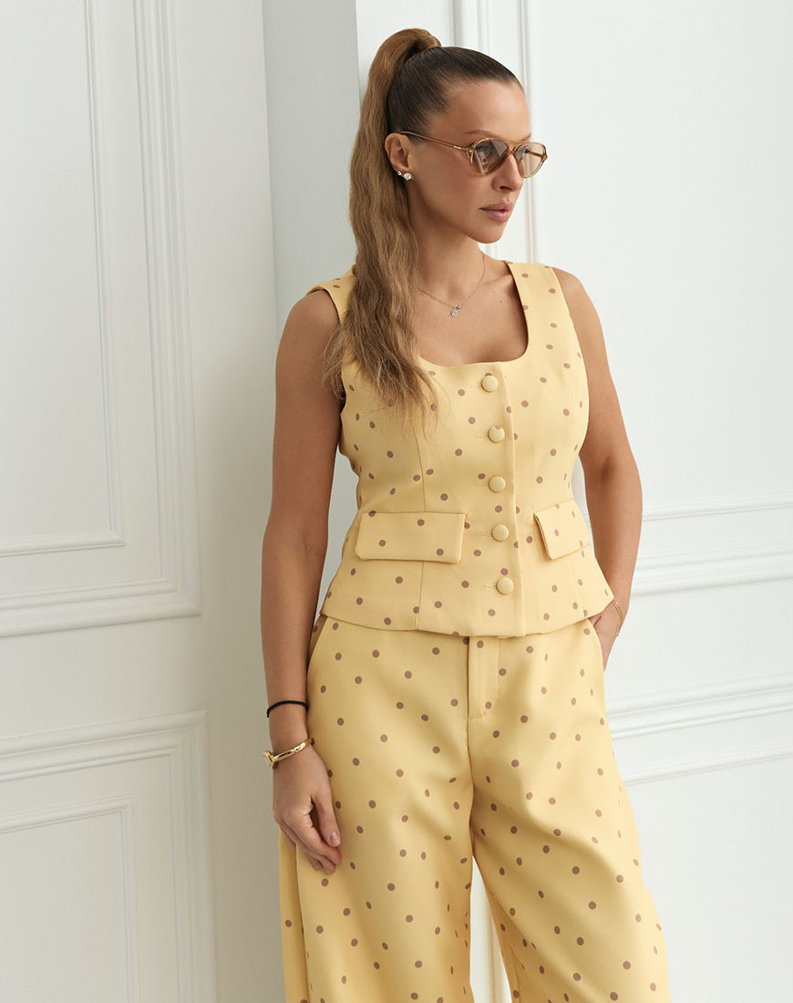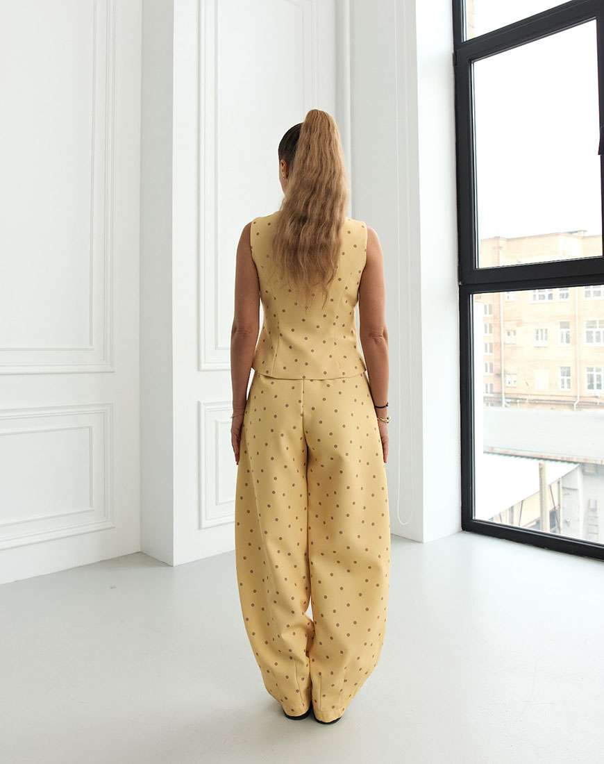 Стильний костюм у жовтому кольорі з коричневим горохом – яскравий акцент у сучасному гардеробі. Комплект складається зі штанів і жилетки.