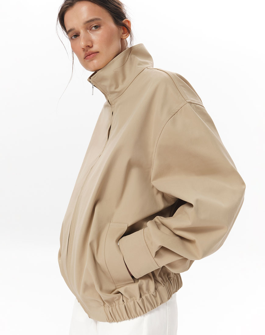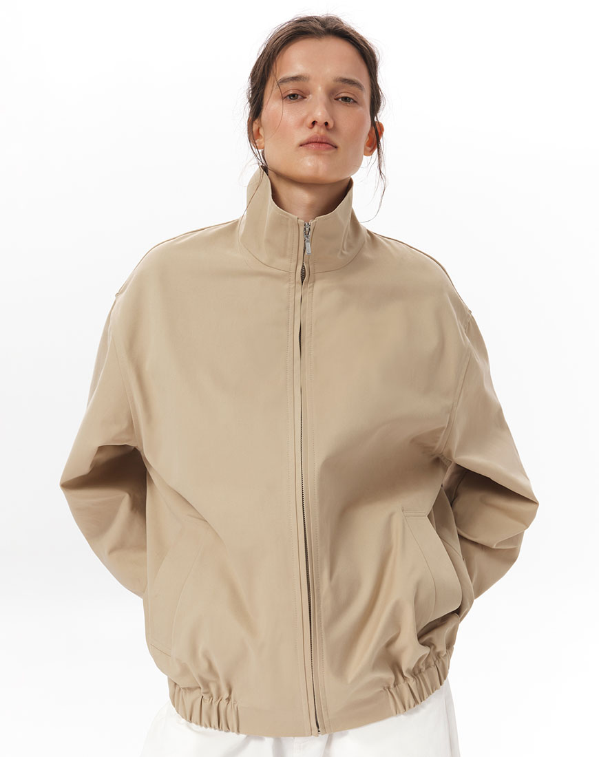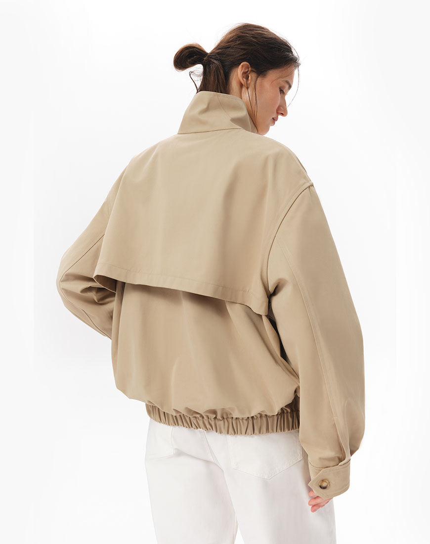Доставка впродовж 5-7 робочих днівСтруктурована куртка-бомбер зі 100% бавовни. Щільна тканина добре тримає форму. Комір-стійка, центральна застібка на блискавці, бічні кишені. Пояс із вбудованою гумкою. На спині розташована кокетка, що додає об’єму силуету. Базова позачасова модель, яка легко інтегрується в гардероб.