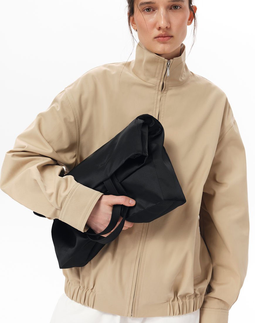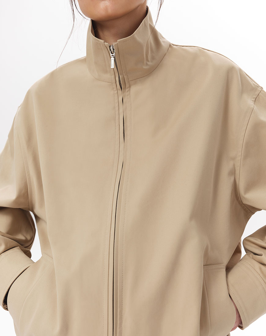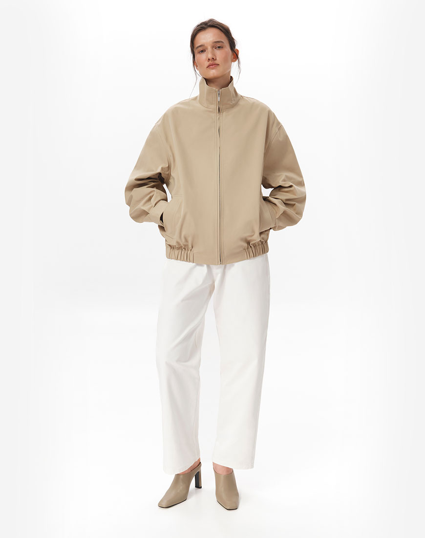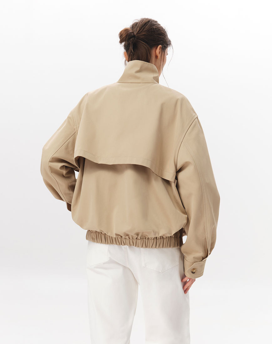 Доставка впродовж 5-7 робочих днівСтруктурована куртка-бомбер зі 100% бавовни. Щільна тканина добре тримає форму. Комір-стійка, центральна застібка на блискавці, бічні кишені. Пояс із вбудованою гумкою. На спині розташована кокетка, що додає об’єму силуету. Базова позачасова модель, яка легко інтегрується в гардероб.