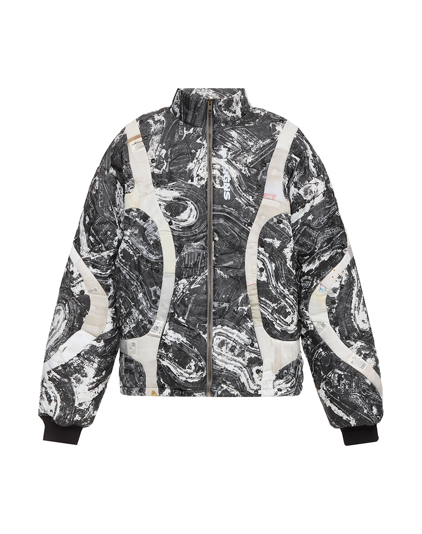 Унікальна куртка-пуховик PLNGNS PUFFER PRINT JACKET, де стоковий нейлон перетворюється на hand-printed canvas з деталями розібраних кросівок, нанесеними вручну. Ця модель стала частиною колекції “IDENTITY”, презентованої 3 лютого 2025 року на Berlin Fashion Week.