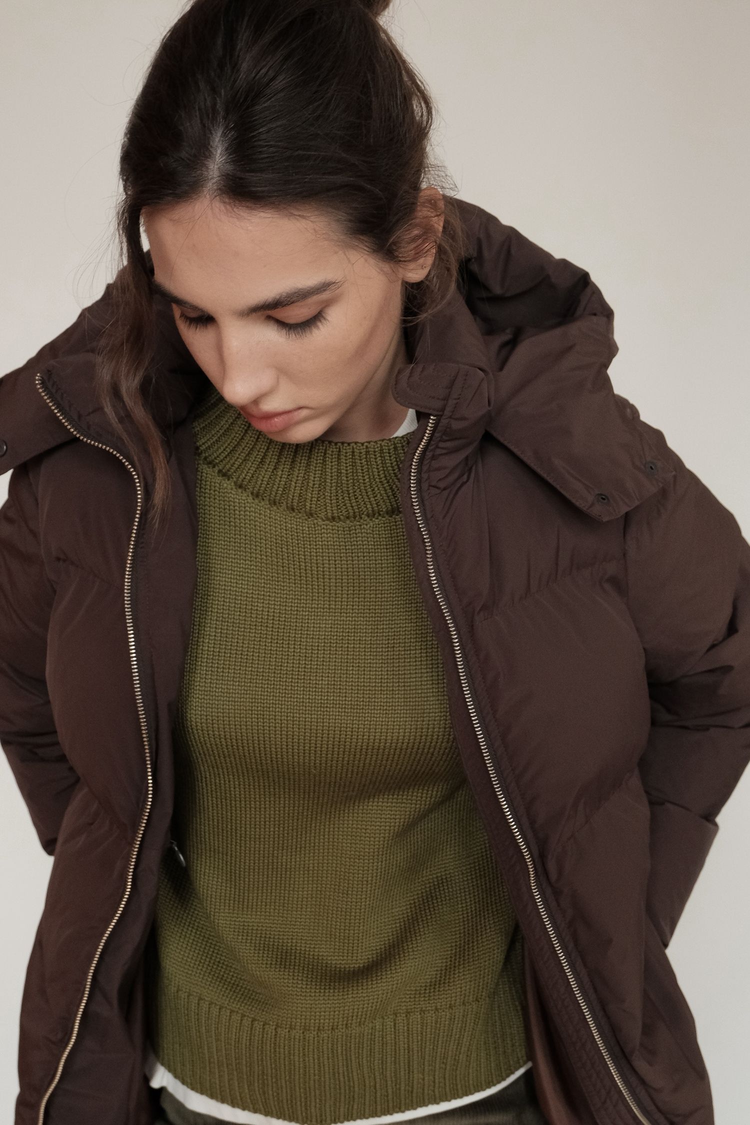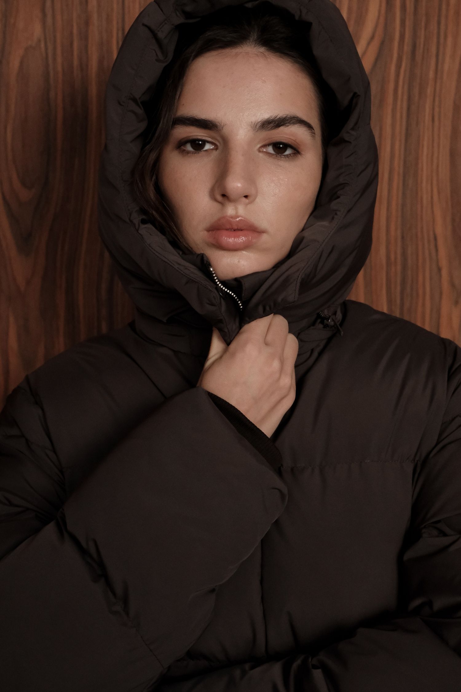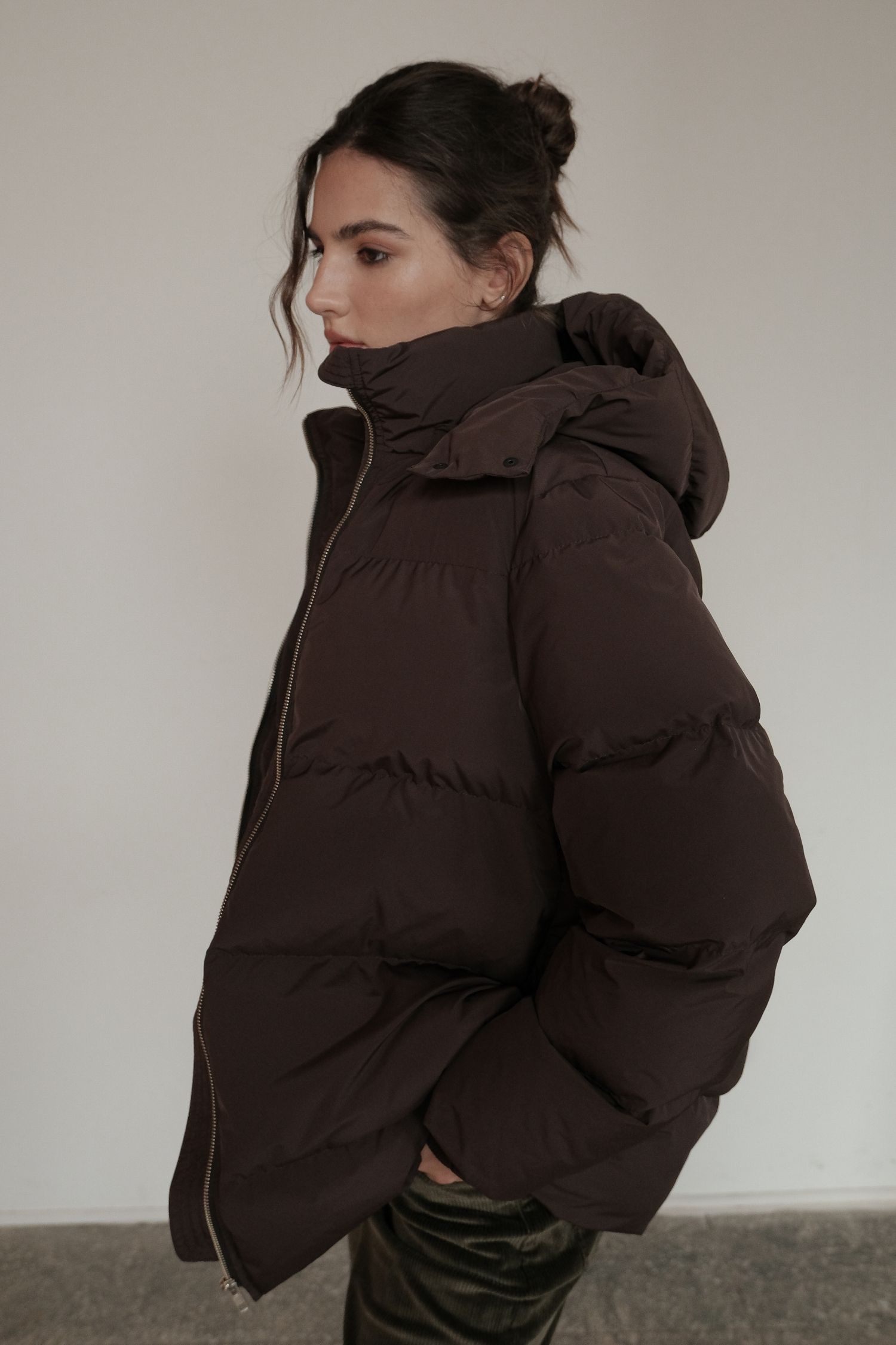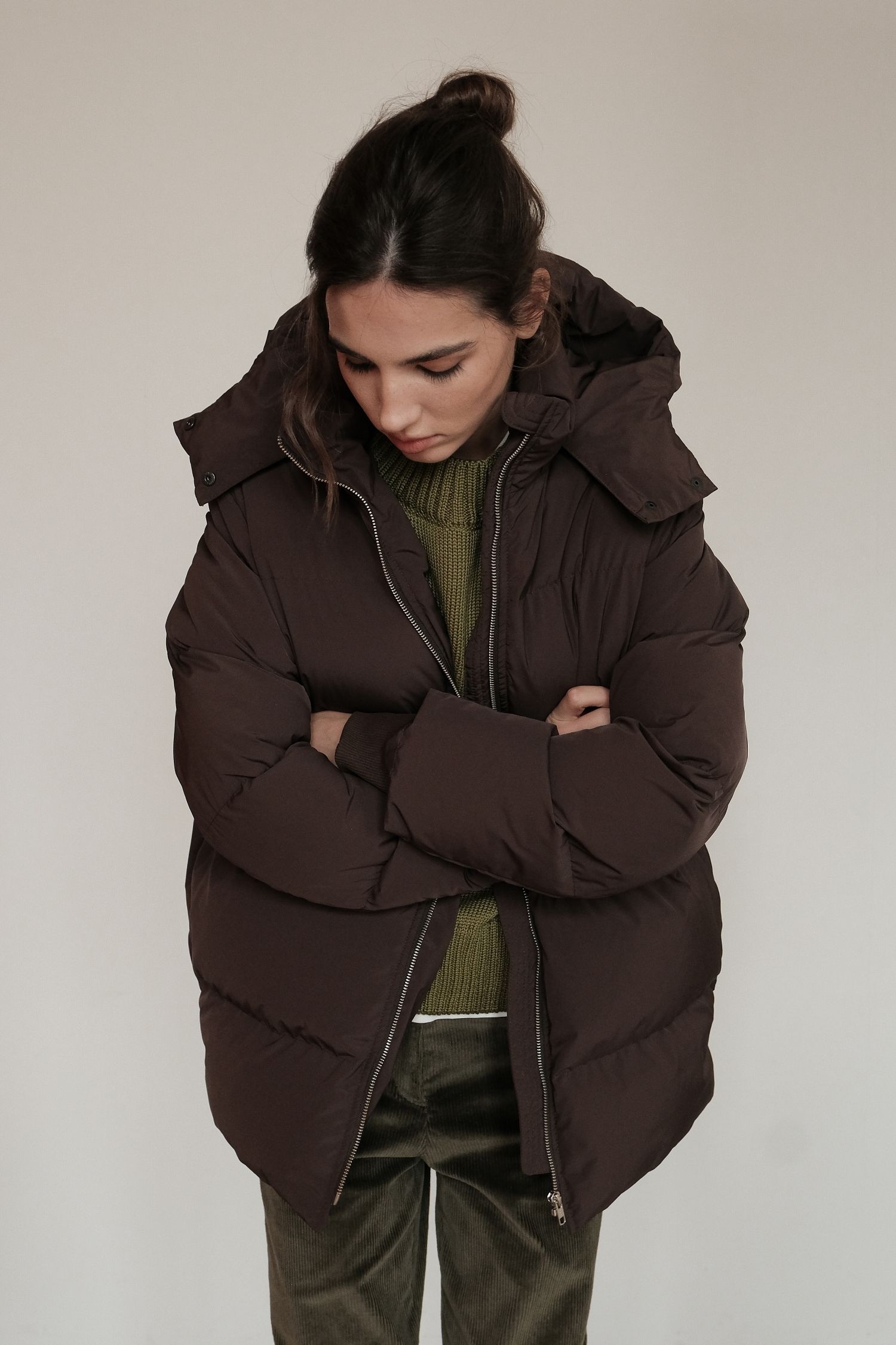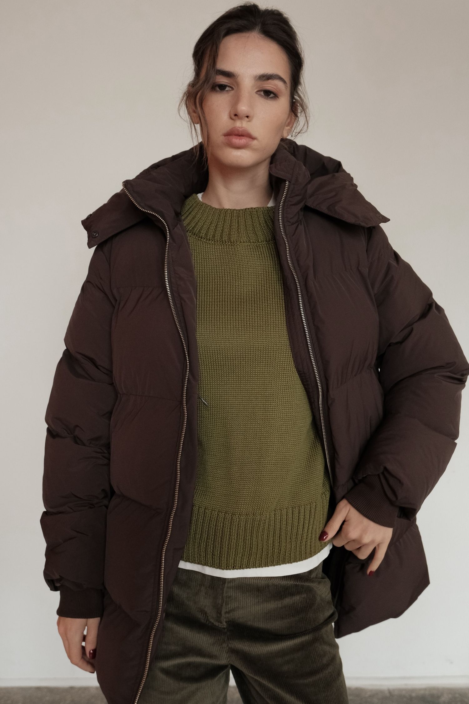 Зимова жіноча куртка вільного крою шоколадного відтінку.