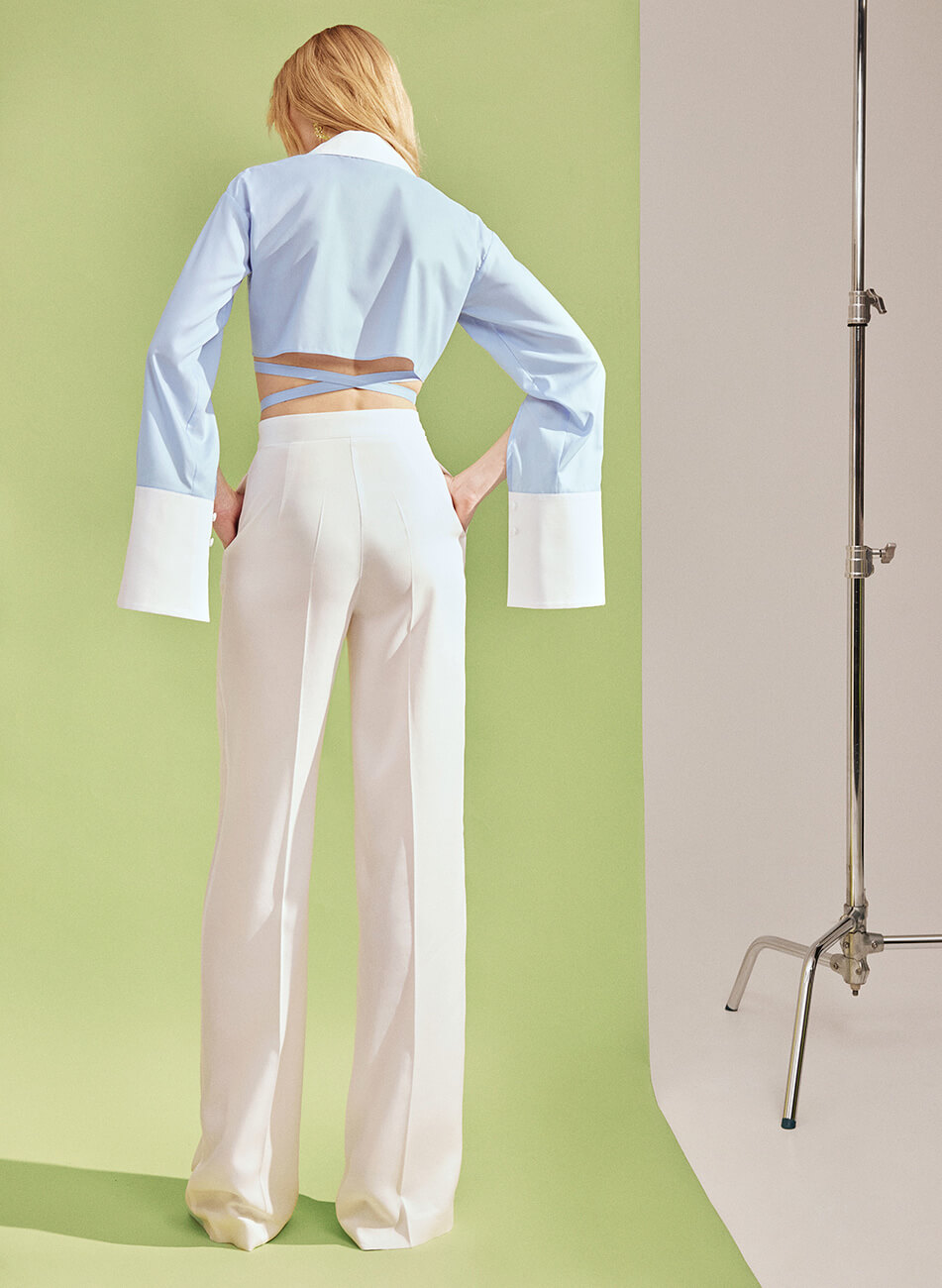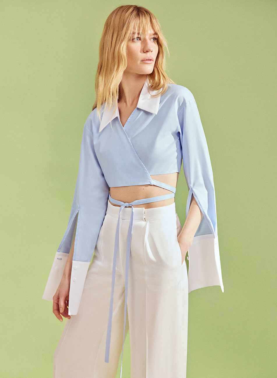 Доставка впродовж 2-5 робочих днівБлакитна укорочена сорочка на запах з бавовни. Високі манжети