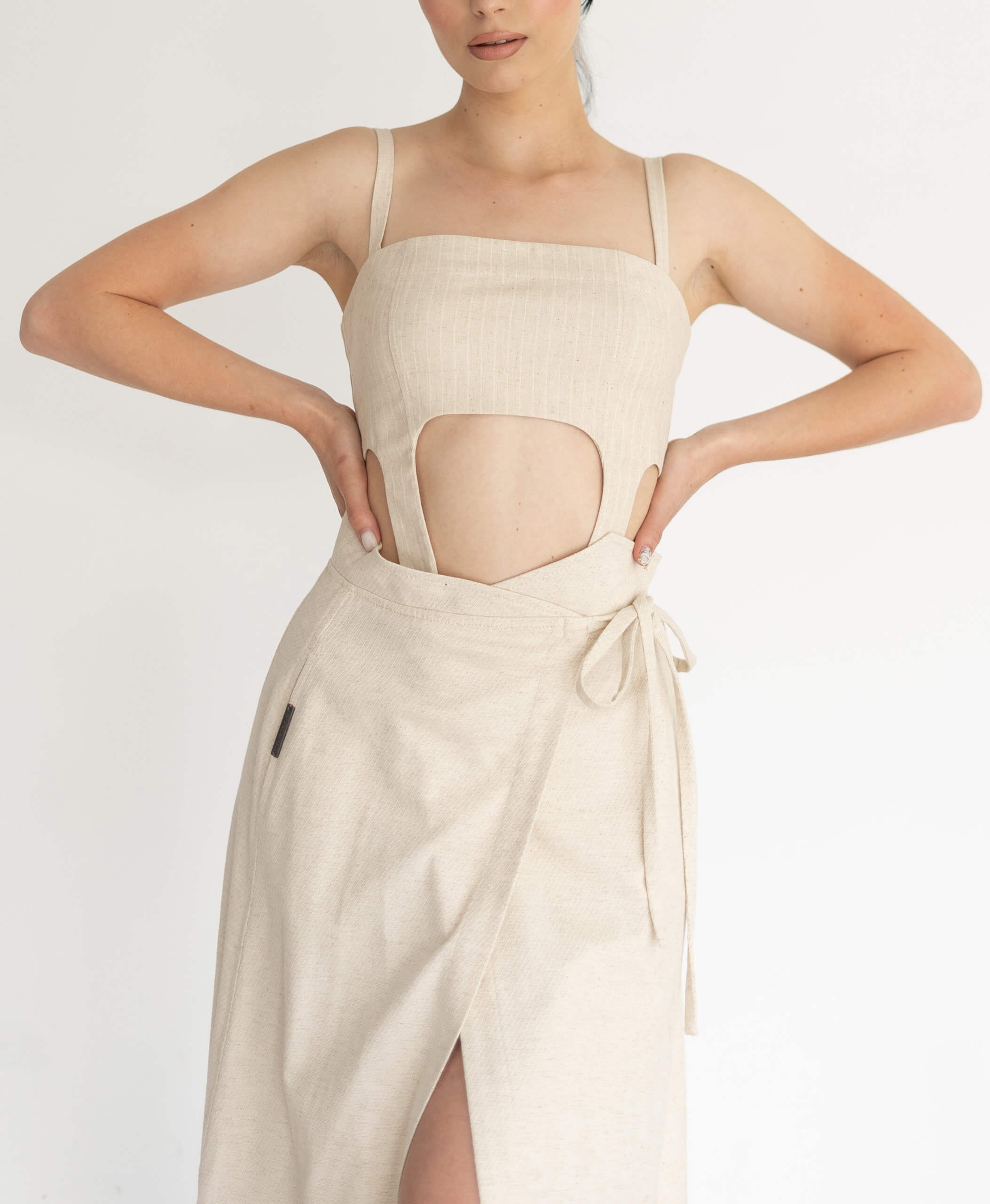 Доставка в течение 2-5 рабочих днейТоп-бандо на тонких бретелях з декоративними підтяжками виконаний з лляної тканини. Позаду на ґудзиках. Бретелі регулюються за довжиною.
