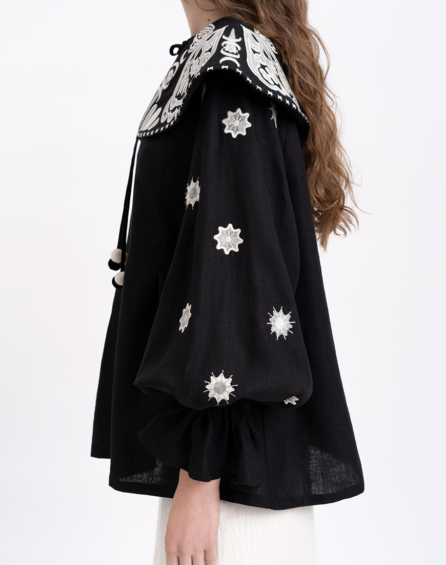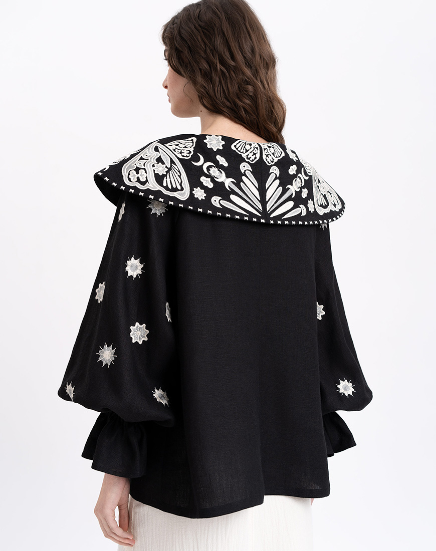 Форма коміра нагадує нам тендітні крила метелика з мозаїчним орнаментом, а світла вишивка на темному тлі асоціюється з легким вечірнім снігопадом. Форма сорочки подібна до образу казкової мантії.