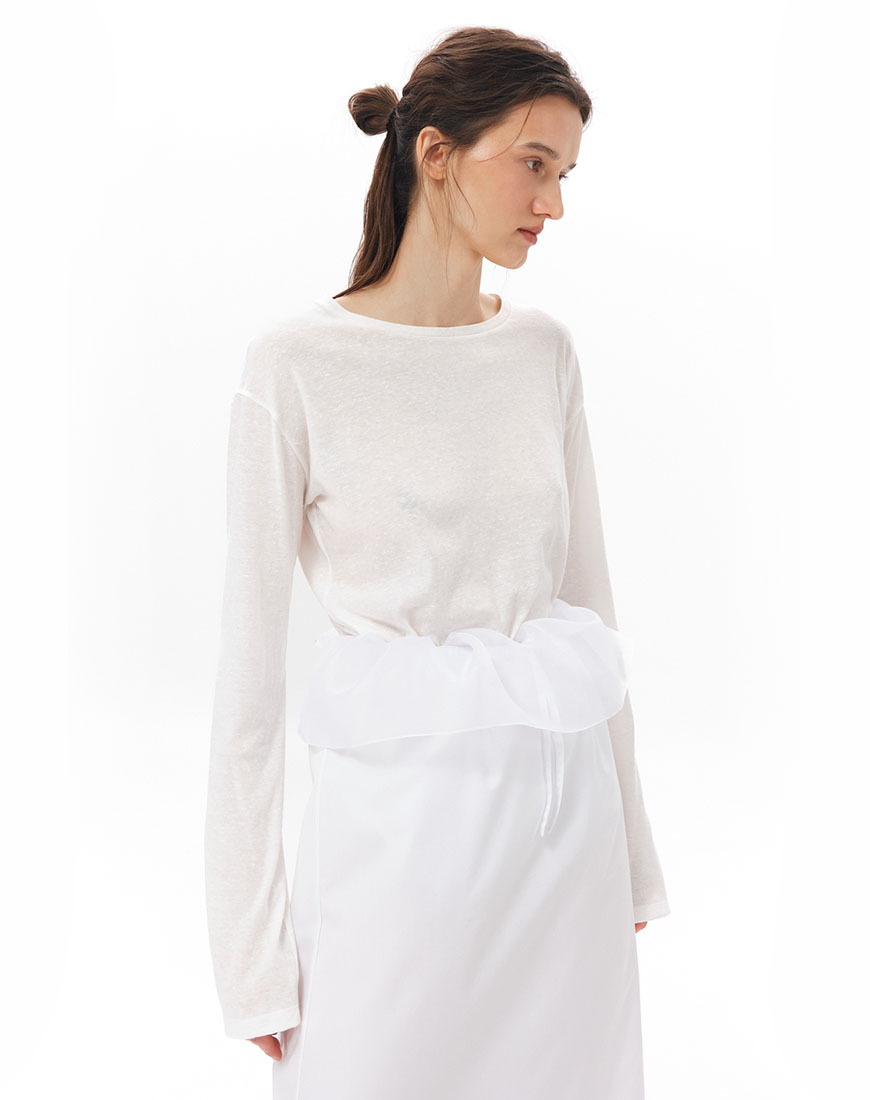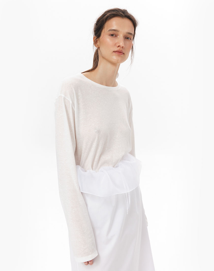 Доставка впродовж 5-7 робочих днівЛонгслів із м’якої тканини на основі бавовни та льону. Прямий крій, вільно прилягає до тіла. Довгі рукави. Класичний круглий виріз.