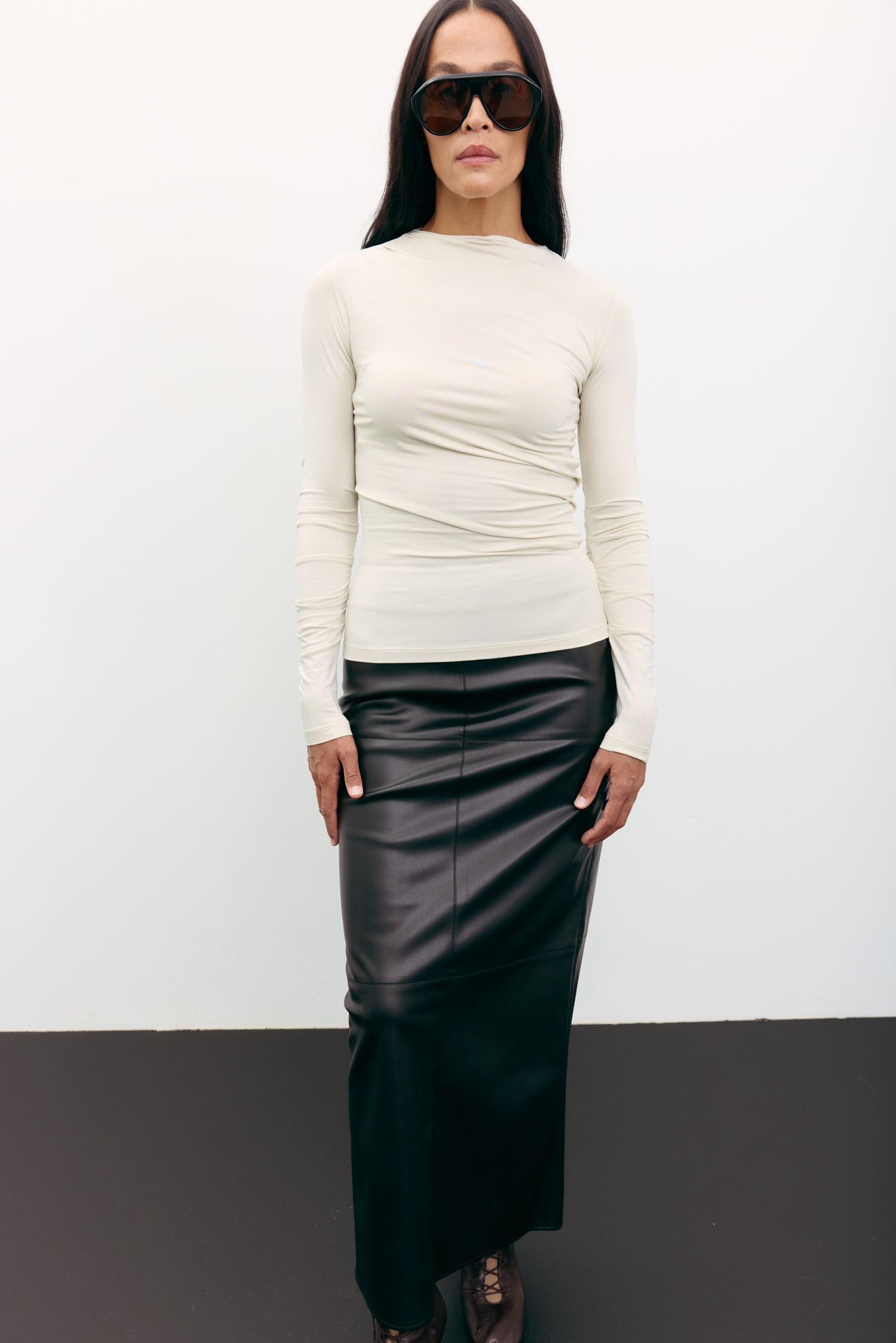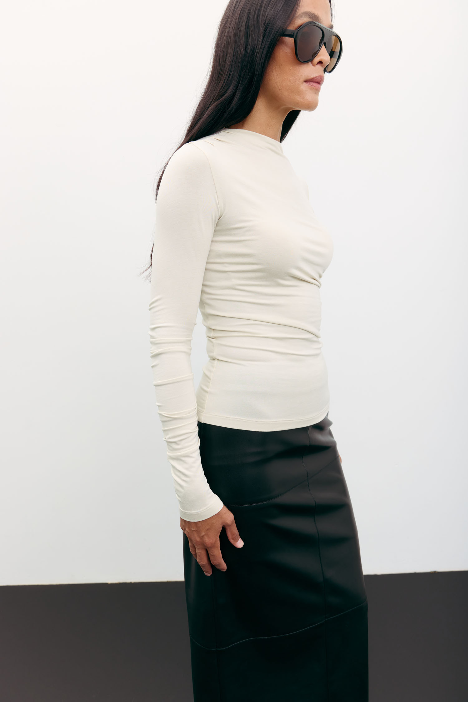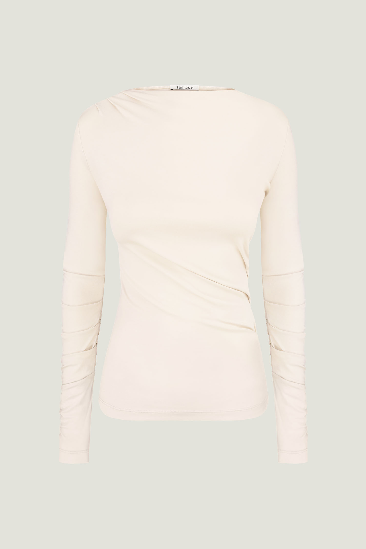 ДоставкаЖіночий лонгслів айворі з трикотажною фактурою, виконаний із легкої віскози. Оформлений акуратними складками. Комфортний протягом дня.