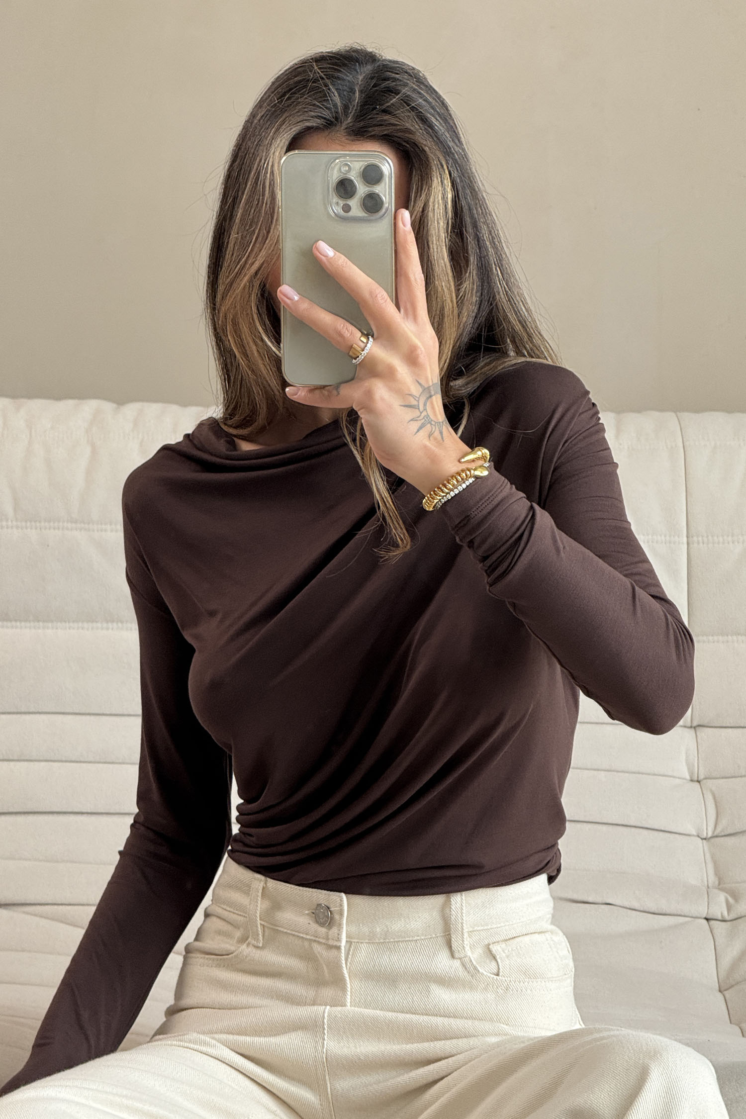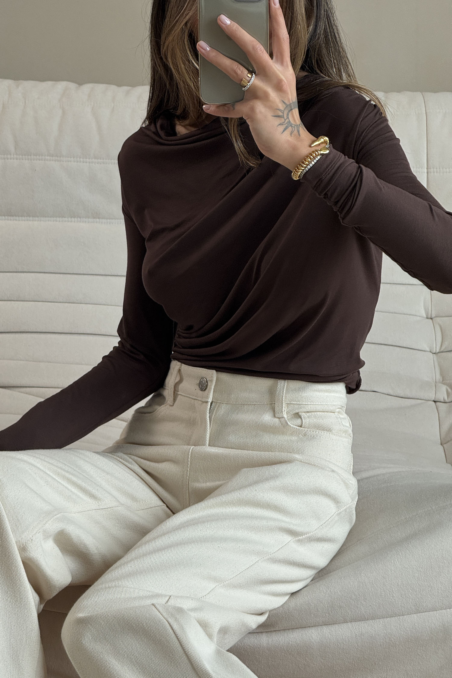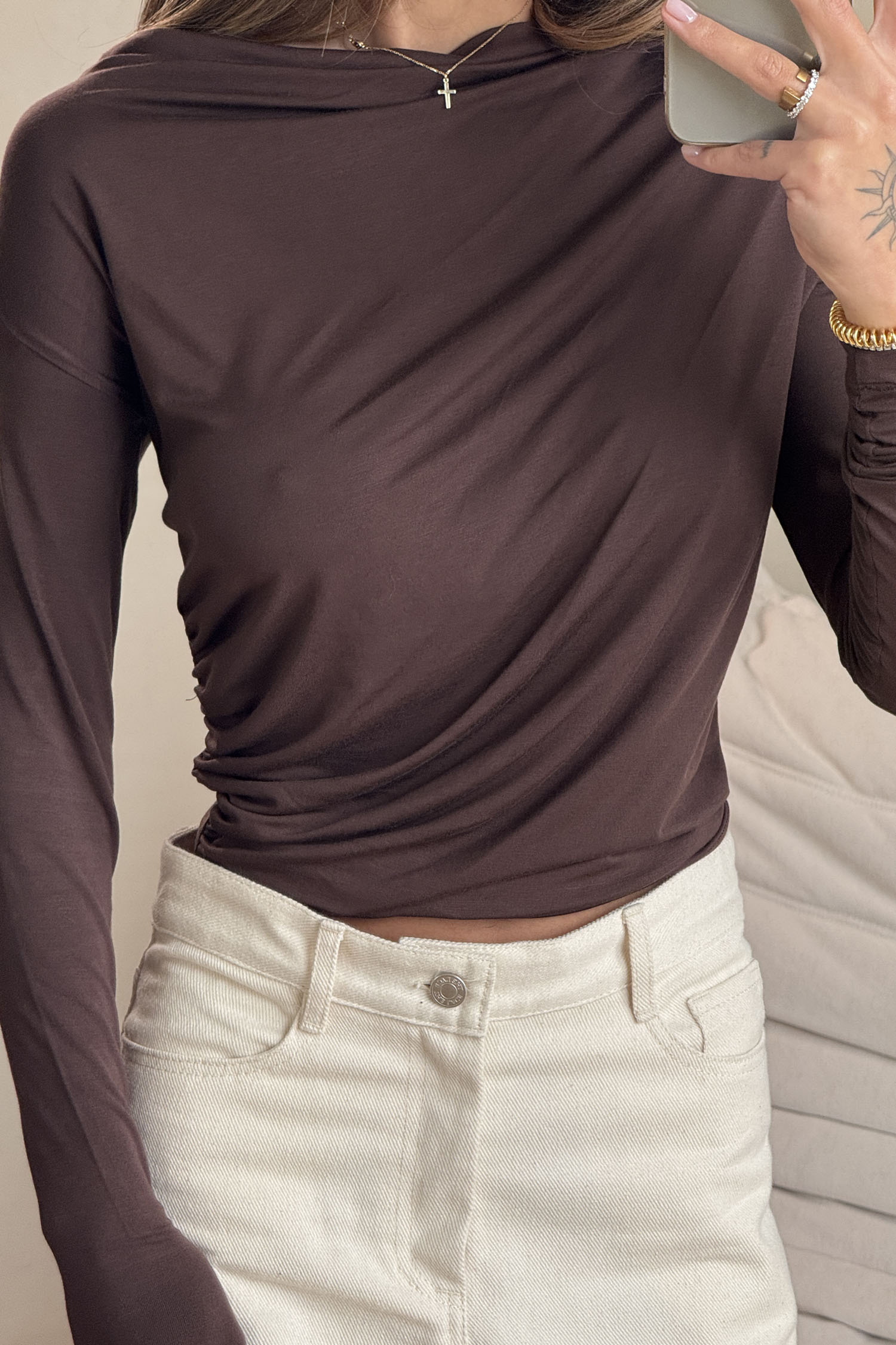 ДоставкаТрикотажний лонгслів шоколадного кольору з декоративними збірками з легкої віскозної тканини.