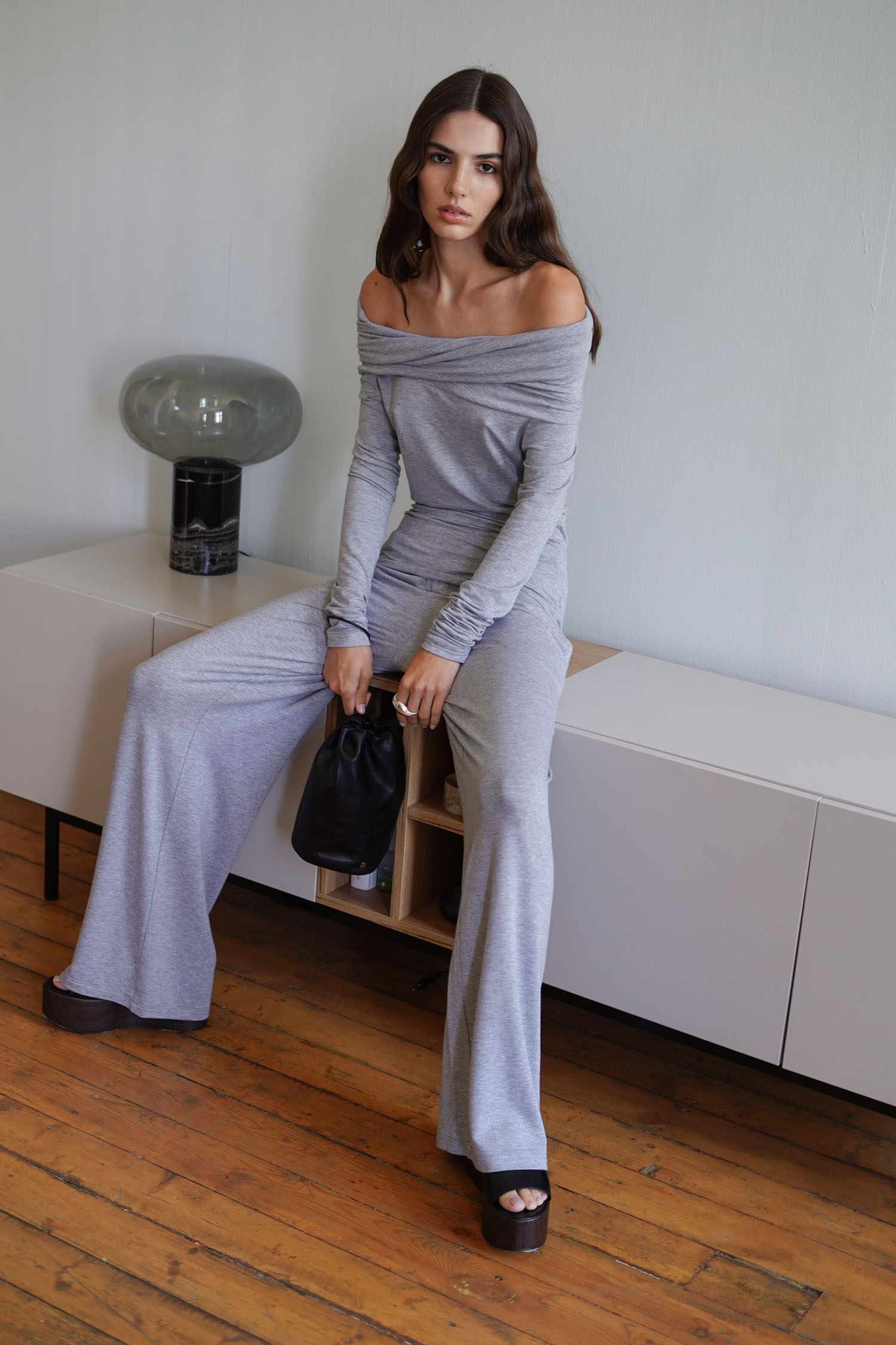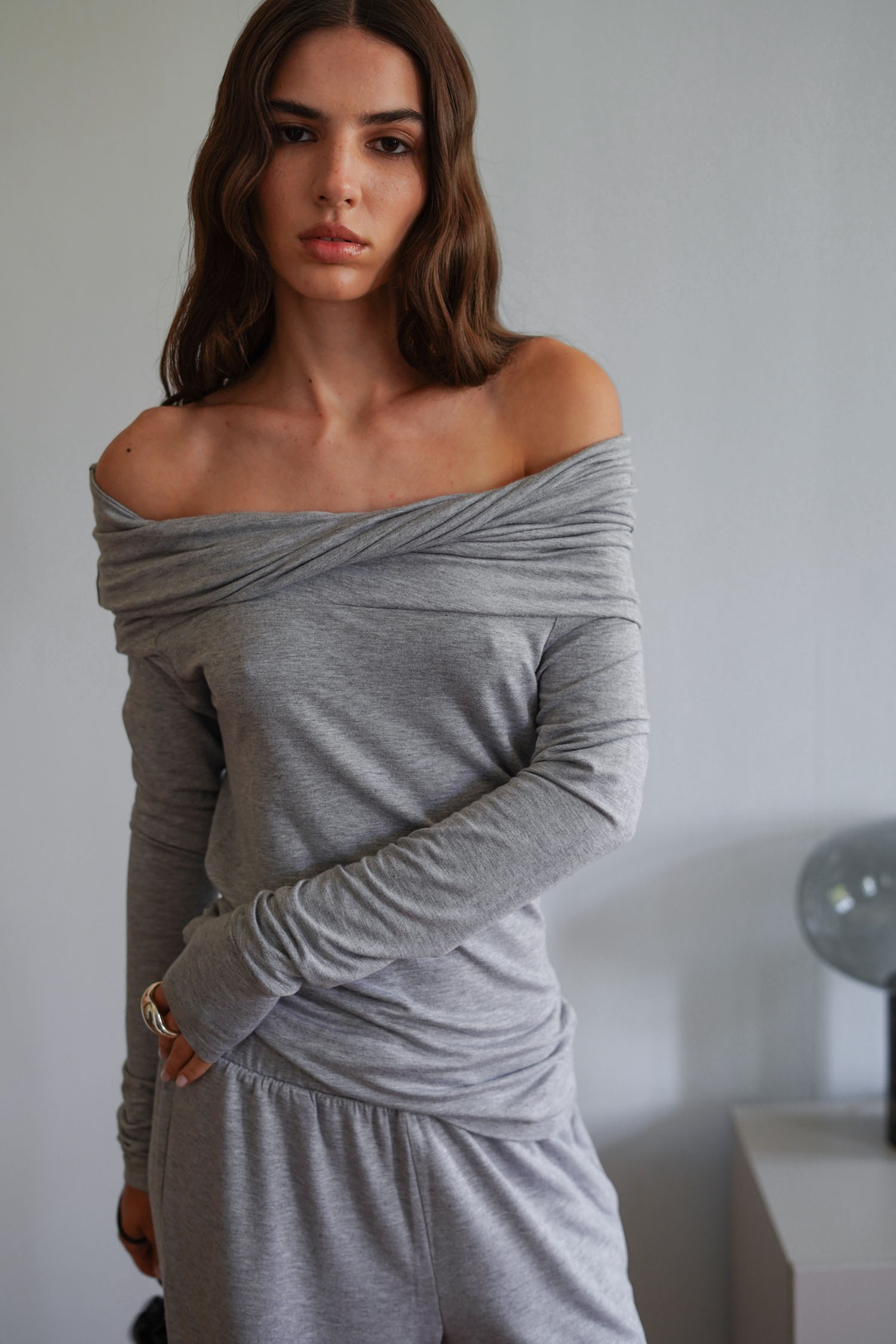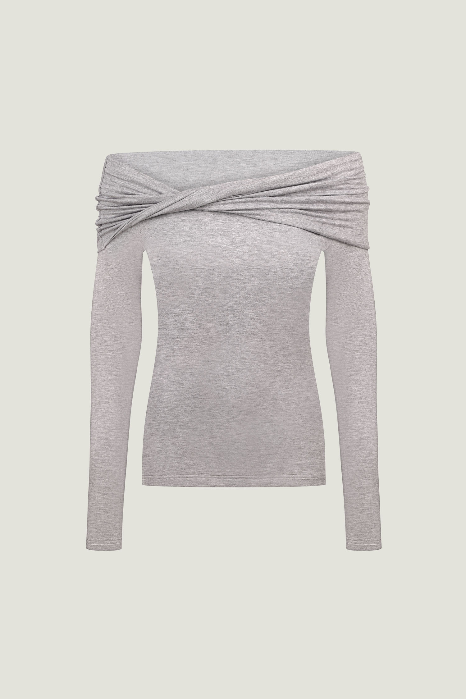 Жіночий лонгслів сірого меланжу з делікатно відкритою лінією плечей. Матеріал – ніжна віскозна тканина, м’яка на дотик. Модель має довгі рукави та акуратний виріз, який відкриває плечі. Стилісти The Lace радять поєднувати з трикотажними брюками в тон для невимушеного образу.