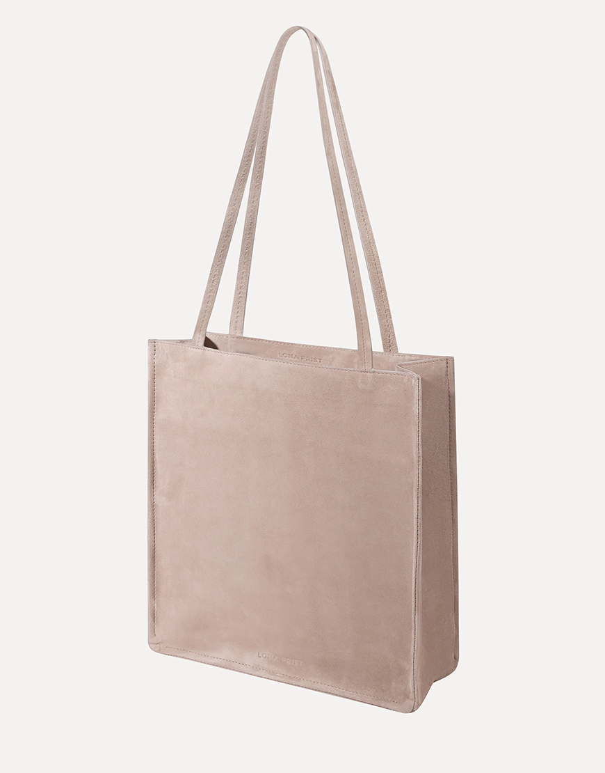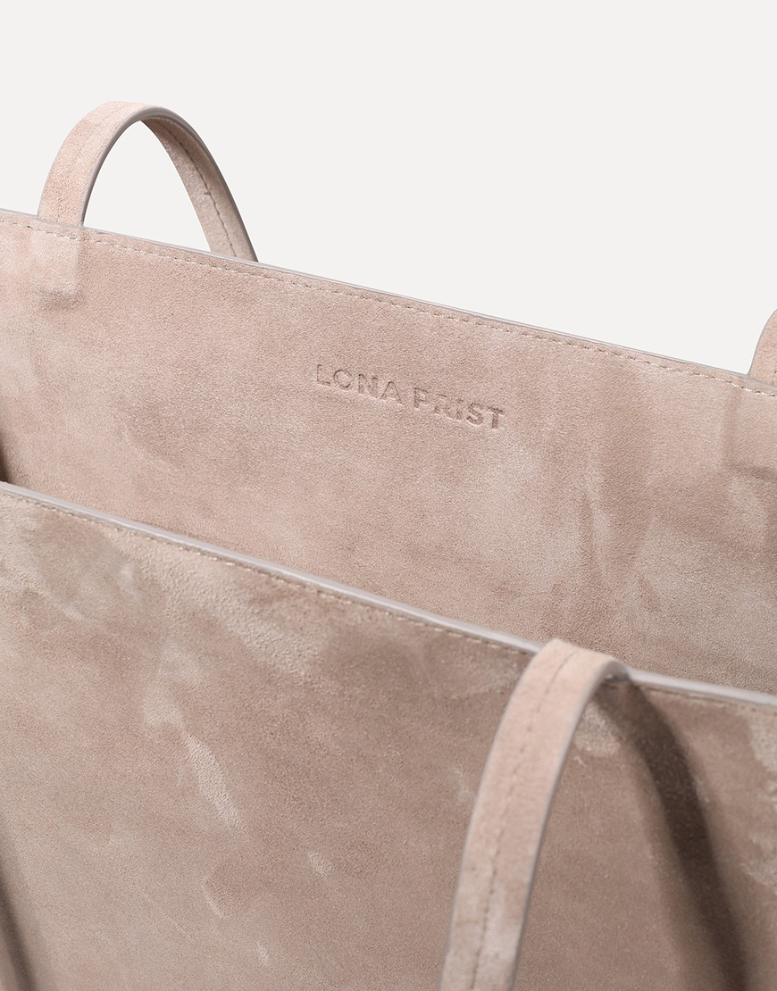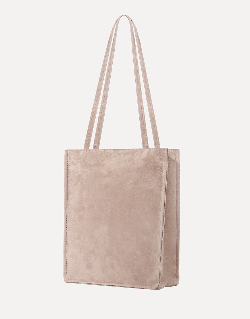 Tote bag із натуральної замші, з замшевою підкладкою, срібною фурнітурою та магнітною застібкою.