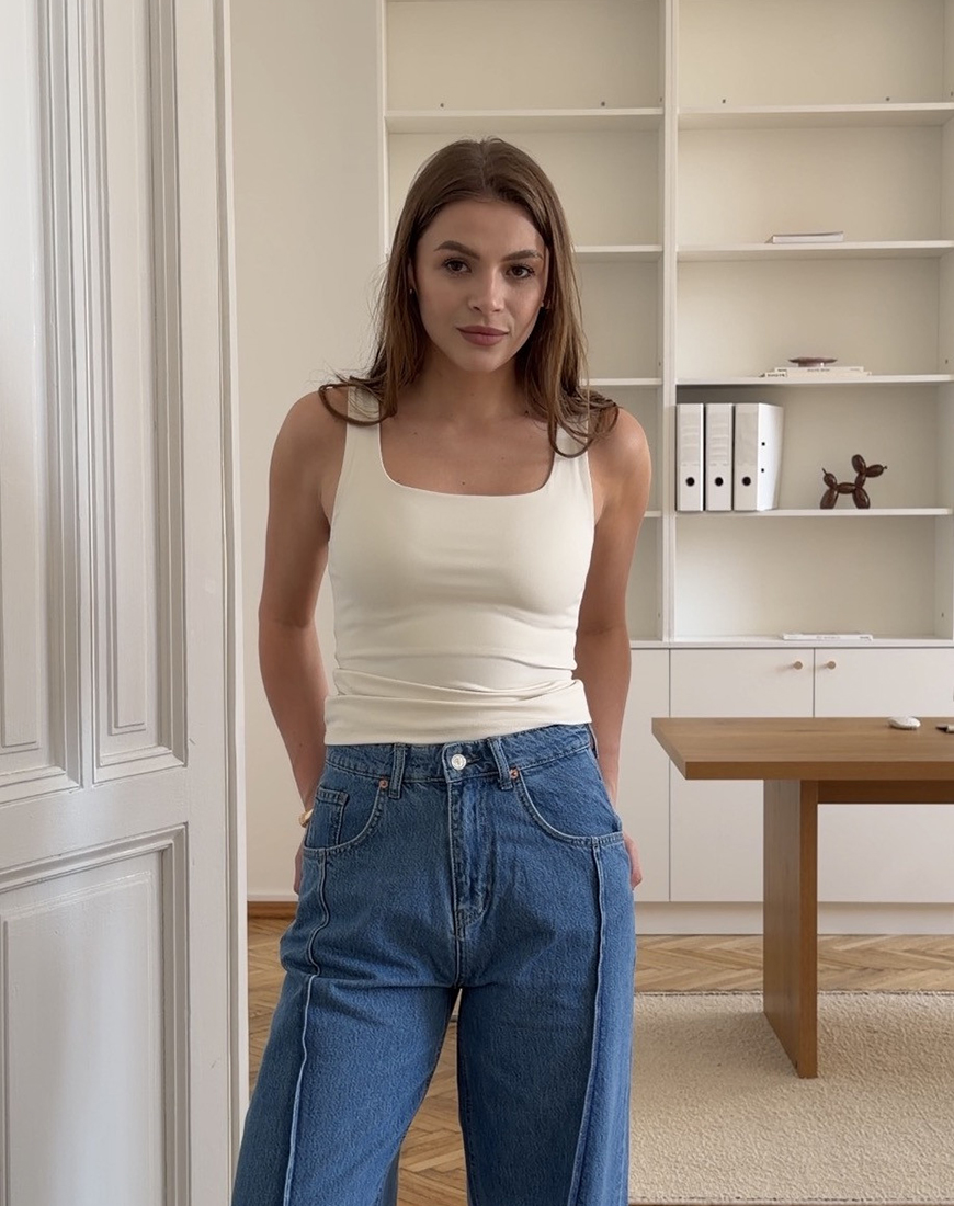 Базова річ, яка виглядає дорого. Майка з широкими бретелями та акуратною посадкою, що красиво підкреслює лінію плечей і тримає форму. Вона не просвічує, щільно, але комфортно сідає по фігурі й легко комбінується з будь-яким низом.