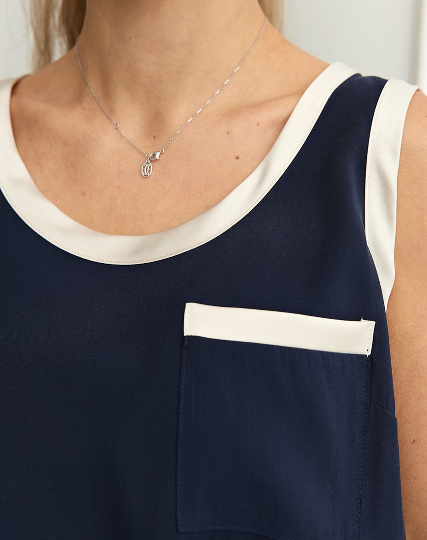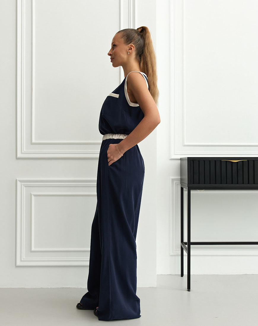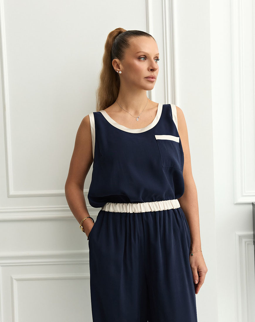Лаконічна майка, виконана у синьому кольорі з делікатними вставками, які додають образу виразності.