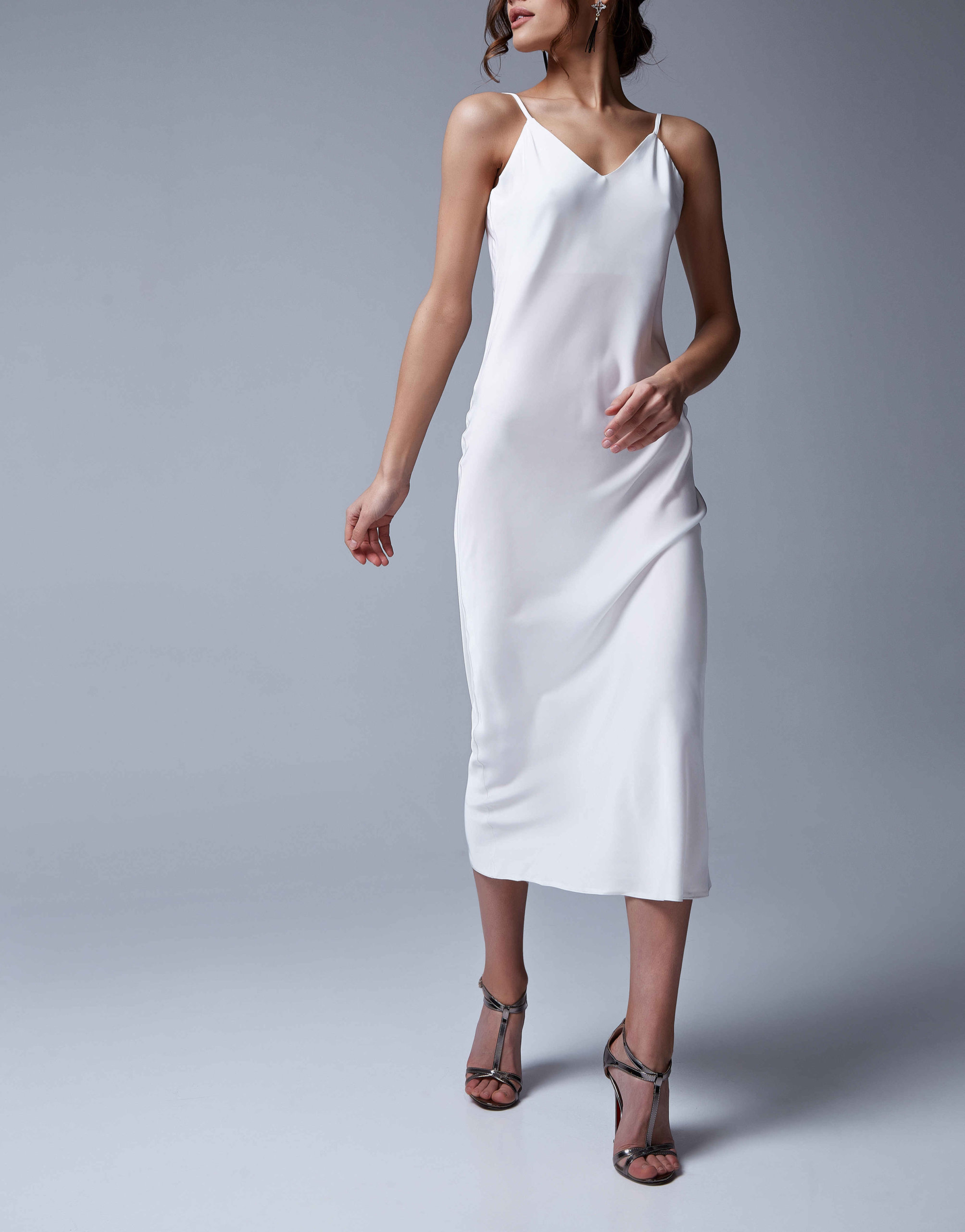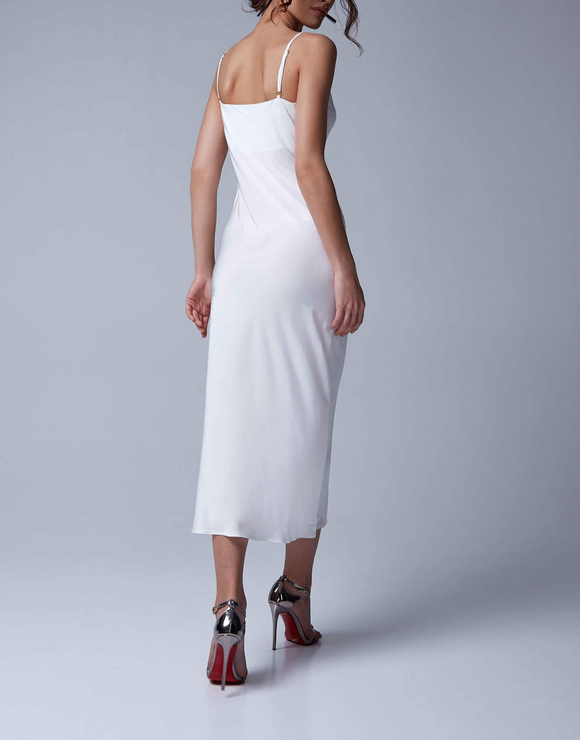 Легка, романтична сукня з ніжної шовкової тканини. Невагома тканина ідеально підходить для літньої спеки. Бретелі регулюються. Ніяких зовнішніх швів.