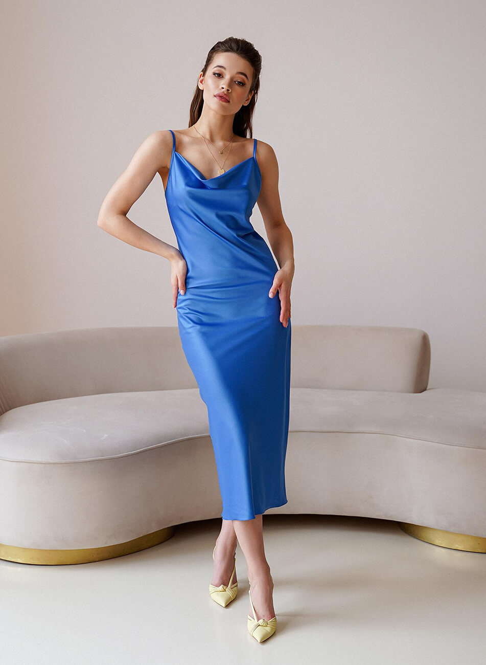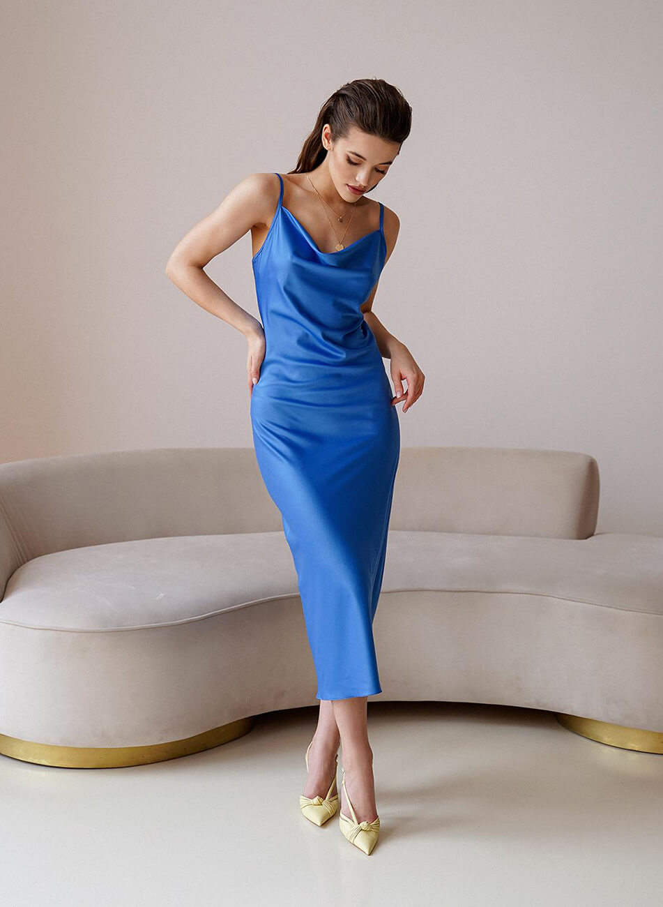 Легка, романтична сукня з ніжної шовкової тканини. Невагома тканина ідеально підходить для літньої спеки. Бретелі регулюються. Жодних зовнішніх швів. Сукня кроє по-косій, що забезпечує ідеальне, м’яке прилягання по фігурі.