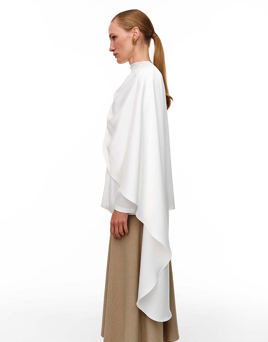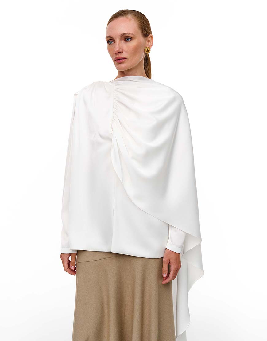 Доставка впродовж 2-10 робочих днівБлуза виконана із ніжного сатину. Вільний силует із делікатними драпіруваннями на плечі створює елегантний об’єм і підкреслює витончену лінію шиї. Асиметричне оздоблення з боковим “шлейфом” додає драматичності образу, роблячи блузу ідеальною для особливих подій.