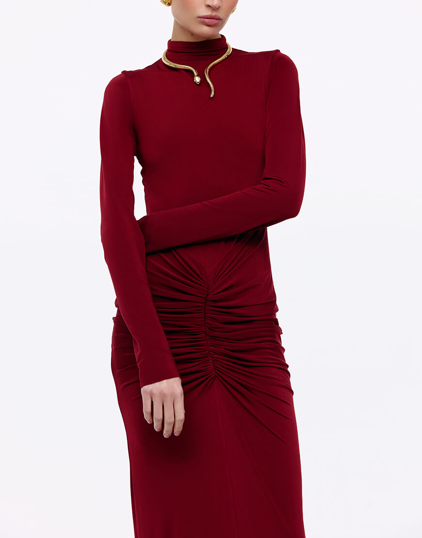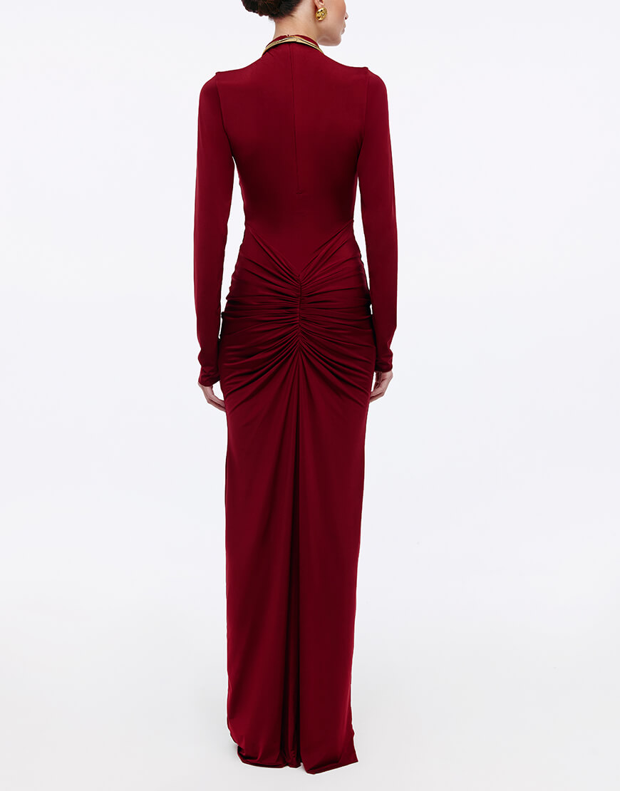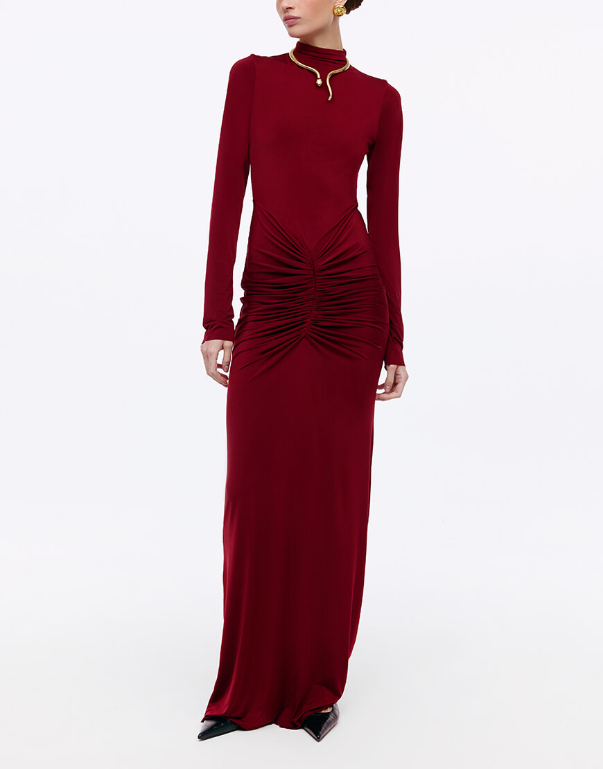 Силуетна сукня з еластичної та приємної на дотик тканини, з драпіруванням по лінії стегон. Сукня максі довжини та виконана на підкладці до лінії талії, застібається на потаємну блискавку по спинці.