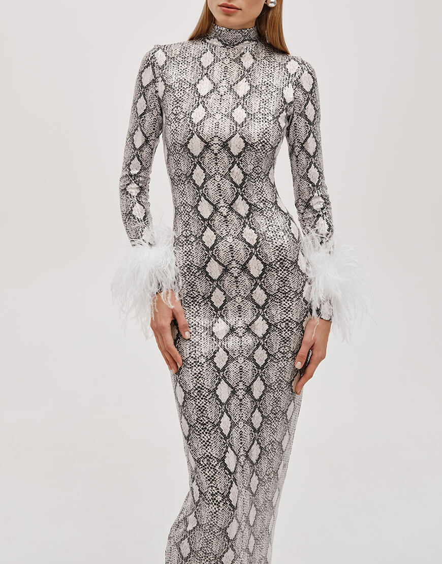 Силуетна сукня з еластичної тканини анімалістичного принту та розшита лелітками. Сукня максі довжини та виконана на підкладці, застібається на потаємну блискавку по спинці. Рукава сукні декоровані пір’ям.