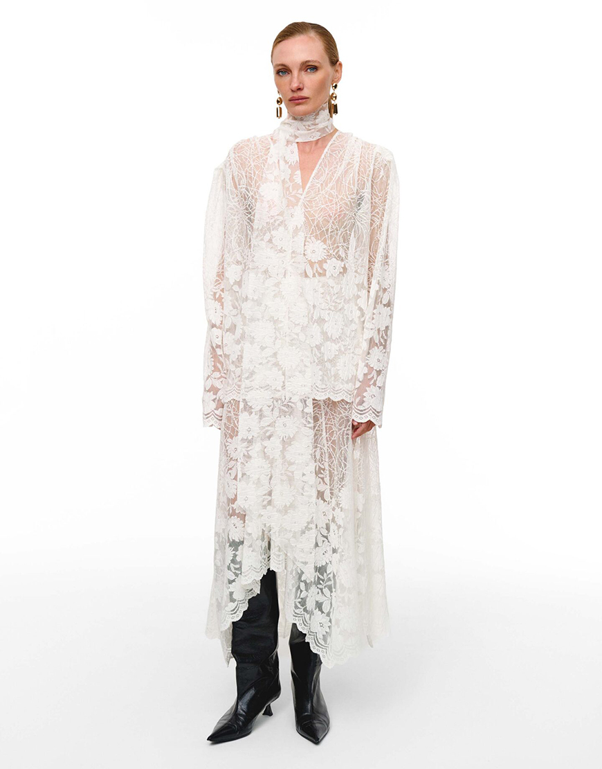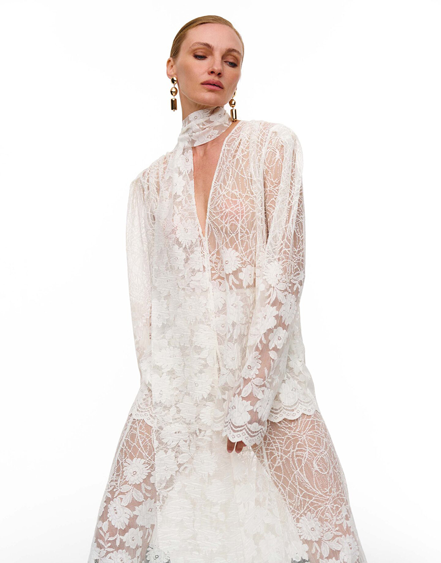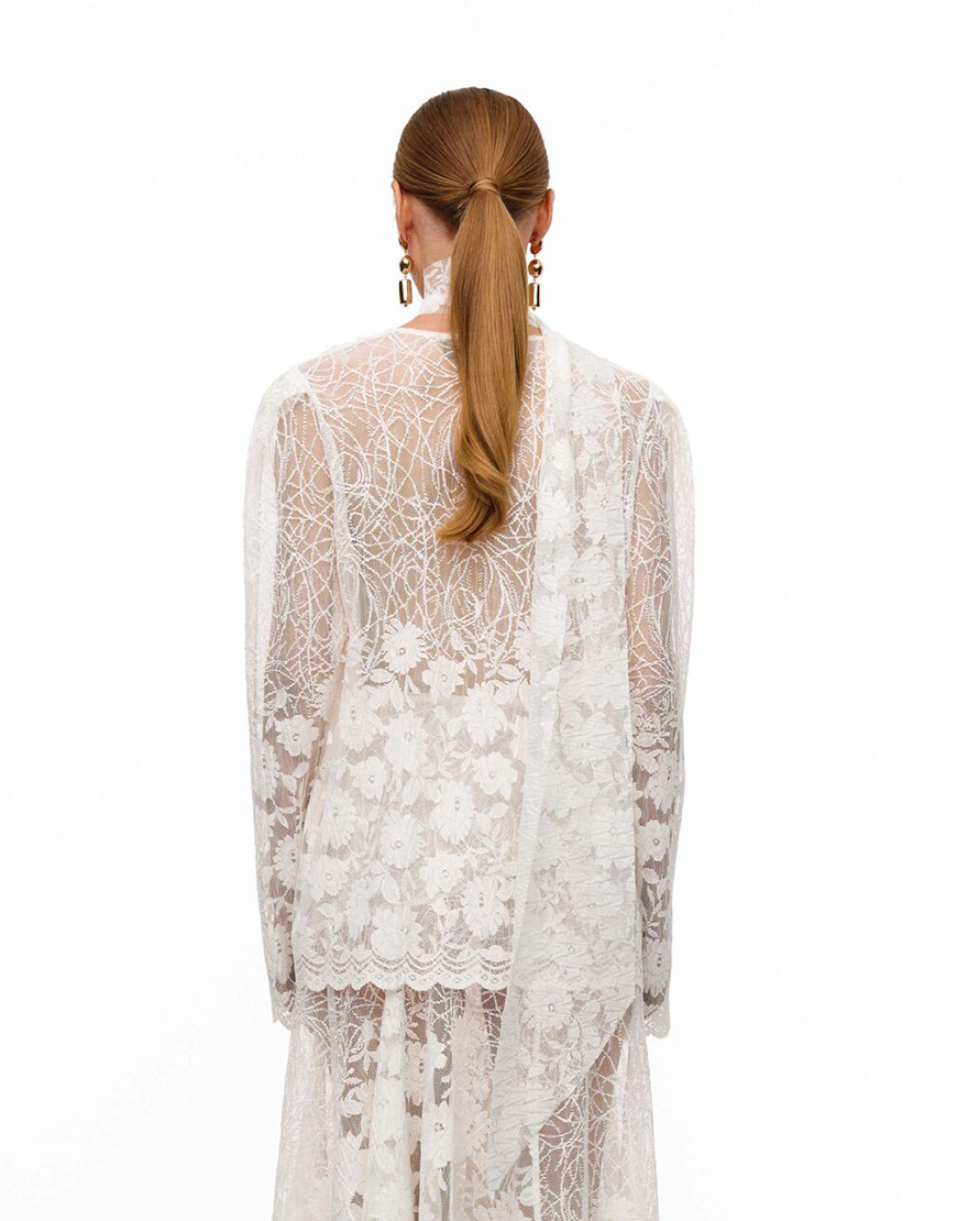 Доставка впродовж 2-10 робочих днівМереживна блуза об’ємного крою. Рукава-ліхтарики та глибокий виріз надають витонченості силуету. Блуза виконана з фігурними вирізами по низу виробу та всіяна матовими лелітками. В комплекті чокер-шалик.