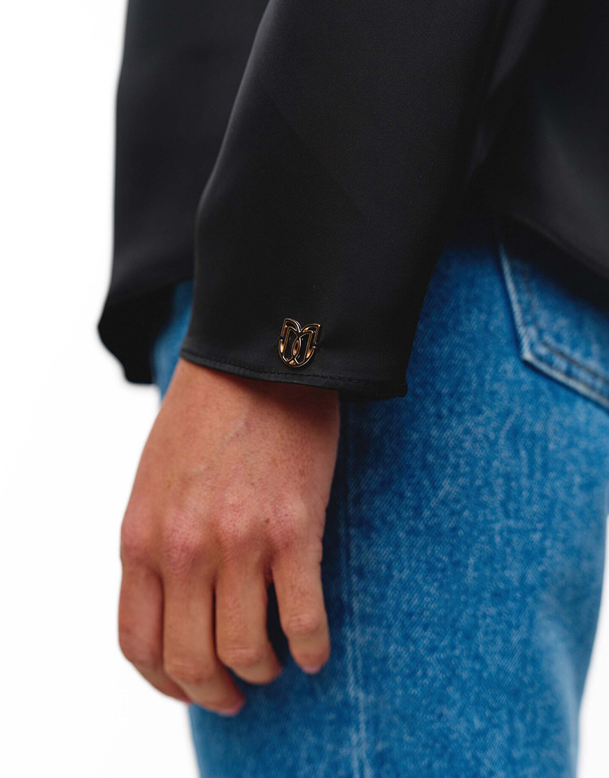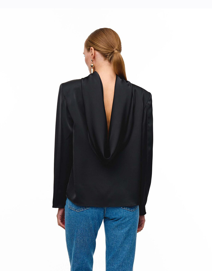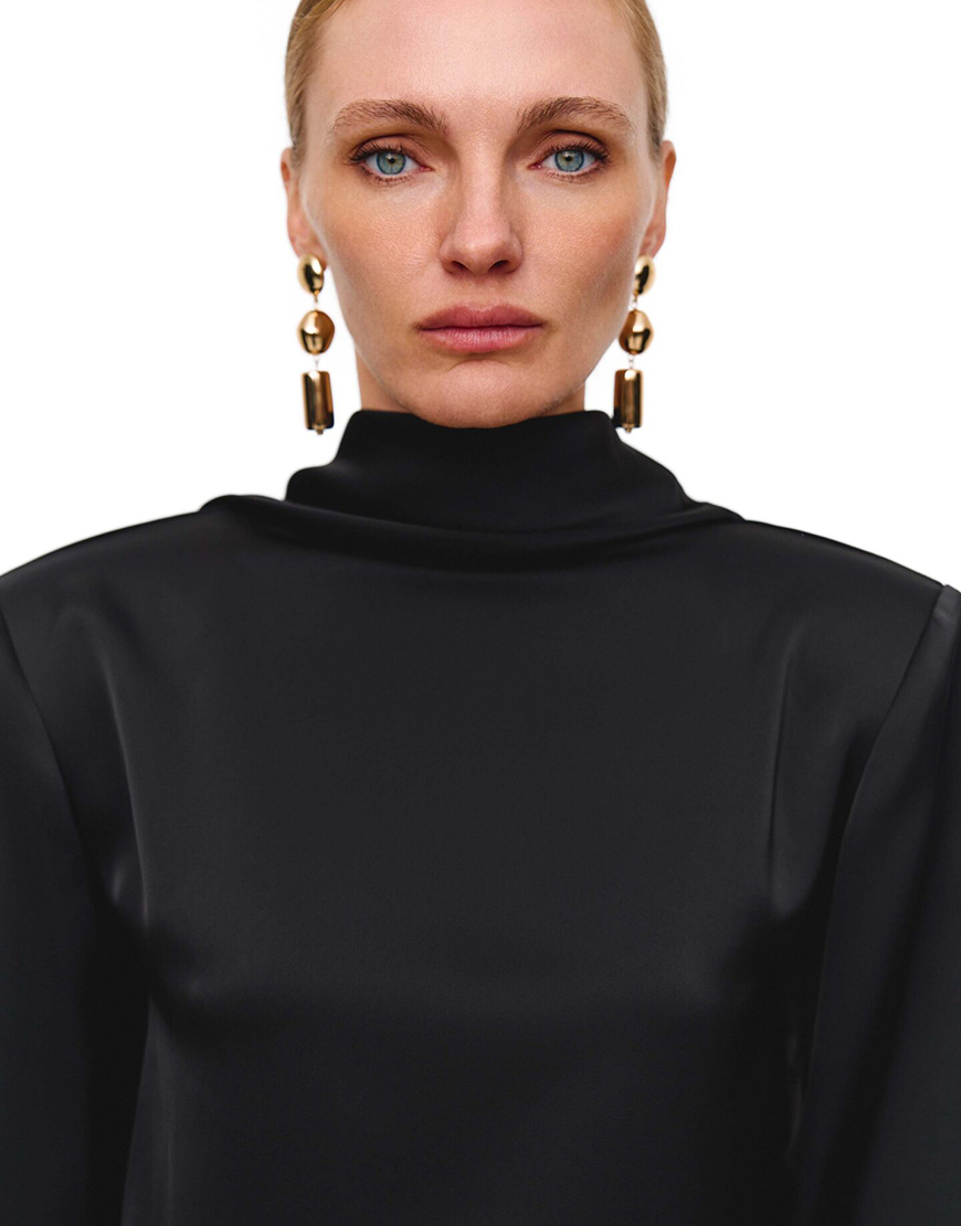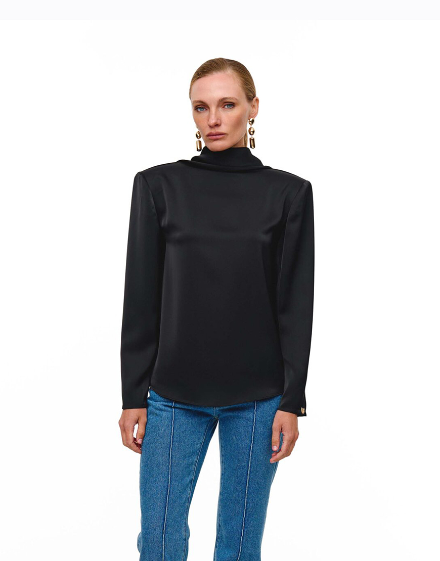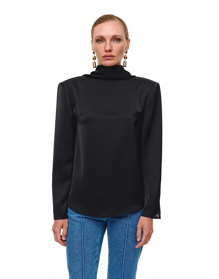 Доставка впродовж 2-10 робочих днівБлуза чорного кольору виготовлена з сатинового матеріалу, який дає глибокий колір та блиск, що елегантно підкреслює її. Архітектура блузи поєднує чітку лінію плечей і високий комір спереду, з ефектним, струмливим вирізом на спині. Продуманий крій гарантує ідеальну посадку, перетворюючи цю річ на центральний елемент вашого гардеробу.