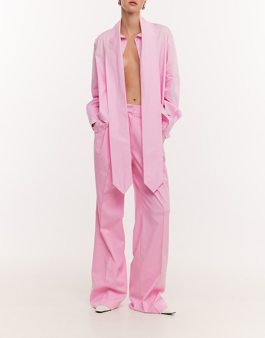 Штани-палаццо з подвійними защіпами та кишенями по бокам. Висока лінія талії та широкий пояс підкреслюють силует. Широкий манжет по низу штанів. Довжина виробу 114 см.