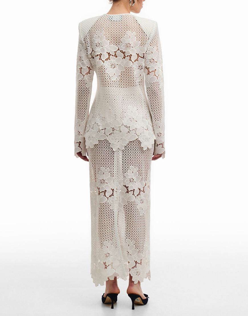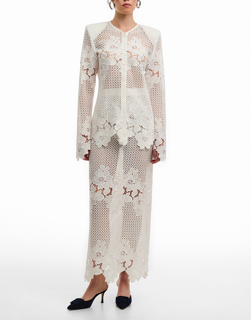 Доставка від 14 днівСпідниця силуетного крою. Спідниця виконана із 100% бавовняного мережива із аплікацією, без підкадки. Спідниця з високою лінією талії. Застібається на потаємну блискавку та має шліцу позаду. Преміальна технологія виконання з усіма закритими швами. Довжина виробу 114 см.