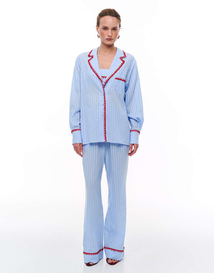 Доставка впродовж 2-10 робочих днівКостюм піжамного стилю з м’якої, бавовняної тканини, який складається з подовженої сорочки вільного крою, штанів на резинці, та топу. Сорочку, штани та топ доповнено контрастним кантом.