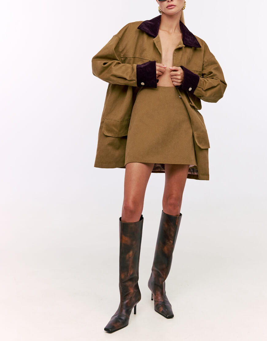 Доставка впродовж 2-10 робочих днівПряма спідниця міні з середньою лінією талії. Застібається ззаду на потаємну блискавку. Довжина спідниці 40 см.
