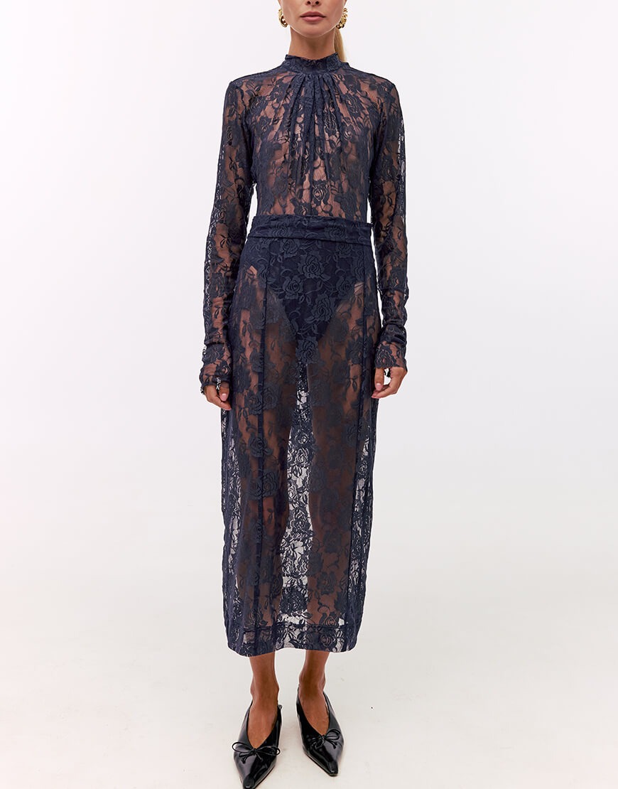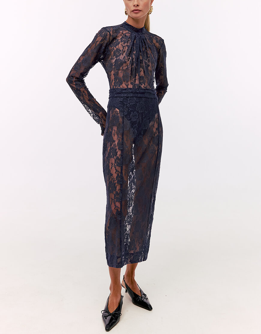 Доставка впродовж 2-10 робочих днівПряма спідниця міді, виконана з фактурного мережива. Спідниця з високою лінією талії. Застібається збоку на потаємну блискавку. Спідниця виконана без підкладки, що підкреслює силует.