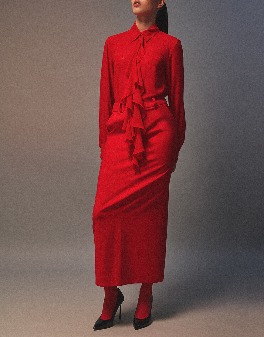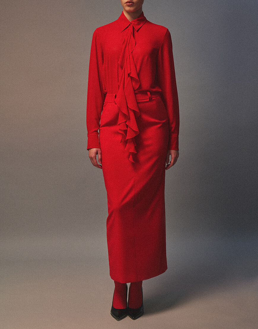 Пряма спідниця максі зі шліцою по спинці. Середня лінія талії. Застібається спереду на блискавку. Довжина спідниці 99 см.