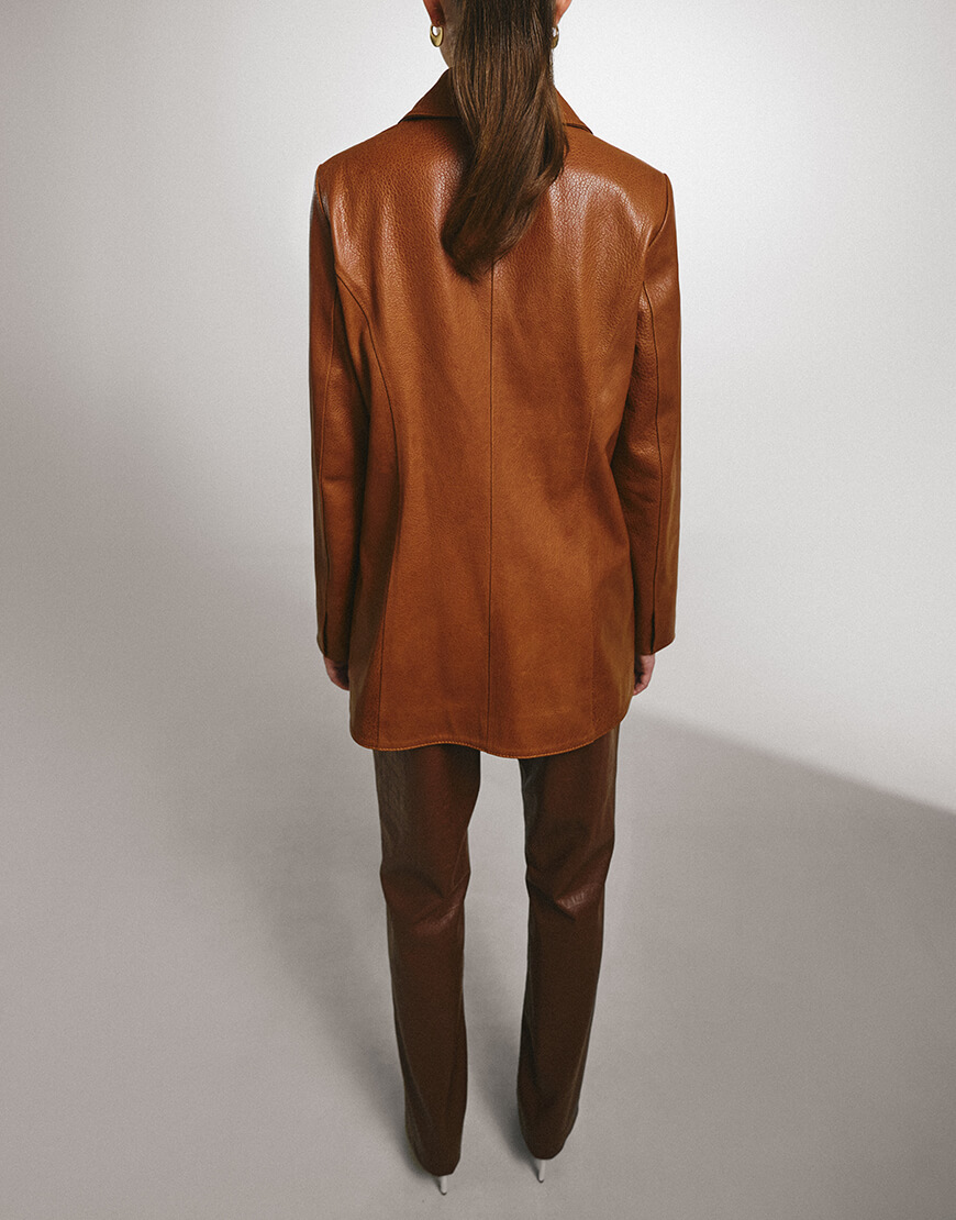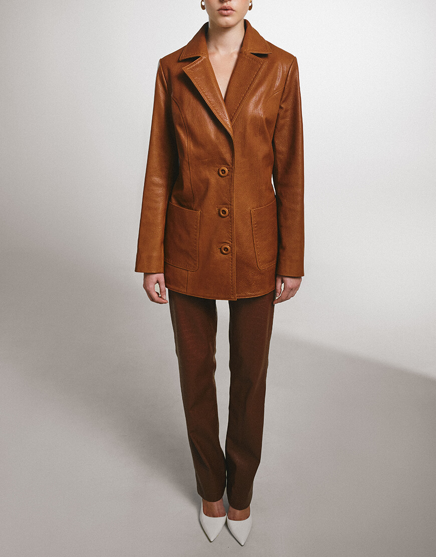 Штани з високою лінією талії на замшевій основі. Штани виконані з фактурної екошкіри з тисненням, що імітує шкіру крокодила. Застібаються спереду на блискавку.