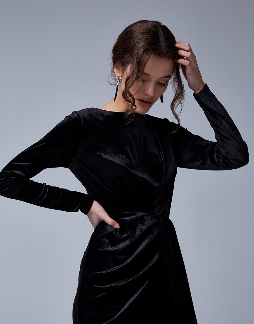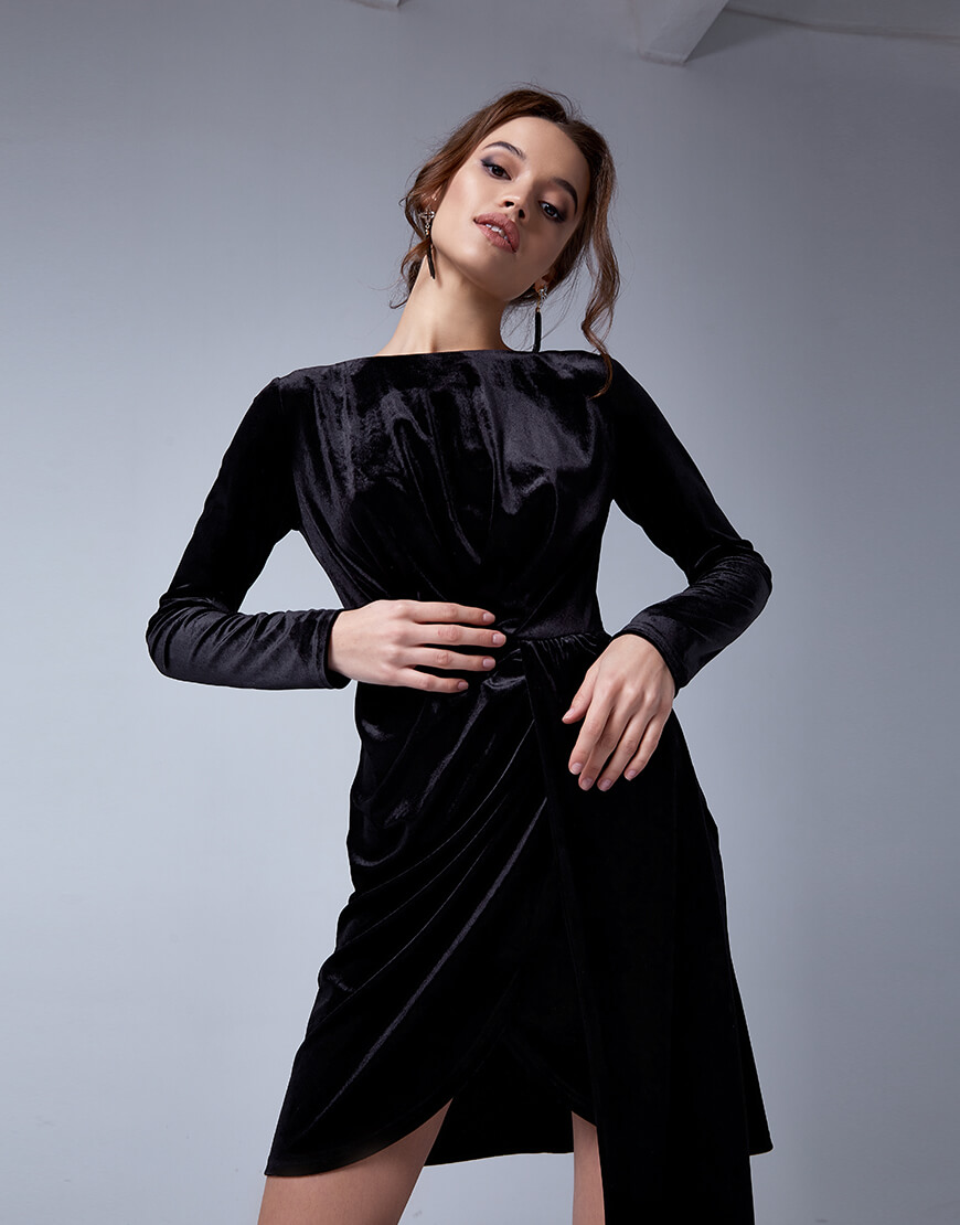 Розкішна оксамитова сукня асиметричного крою. Спідниця із запахом. Застібається ззаду на потаємну блискавку.