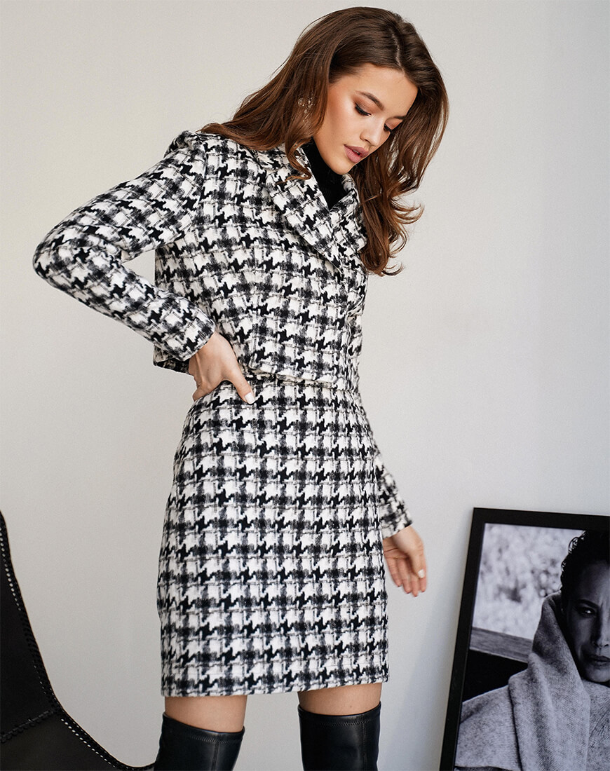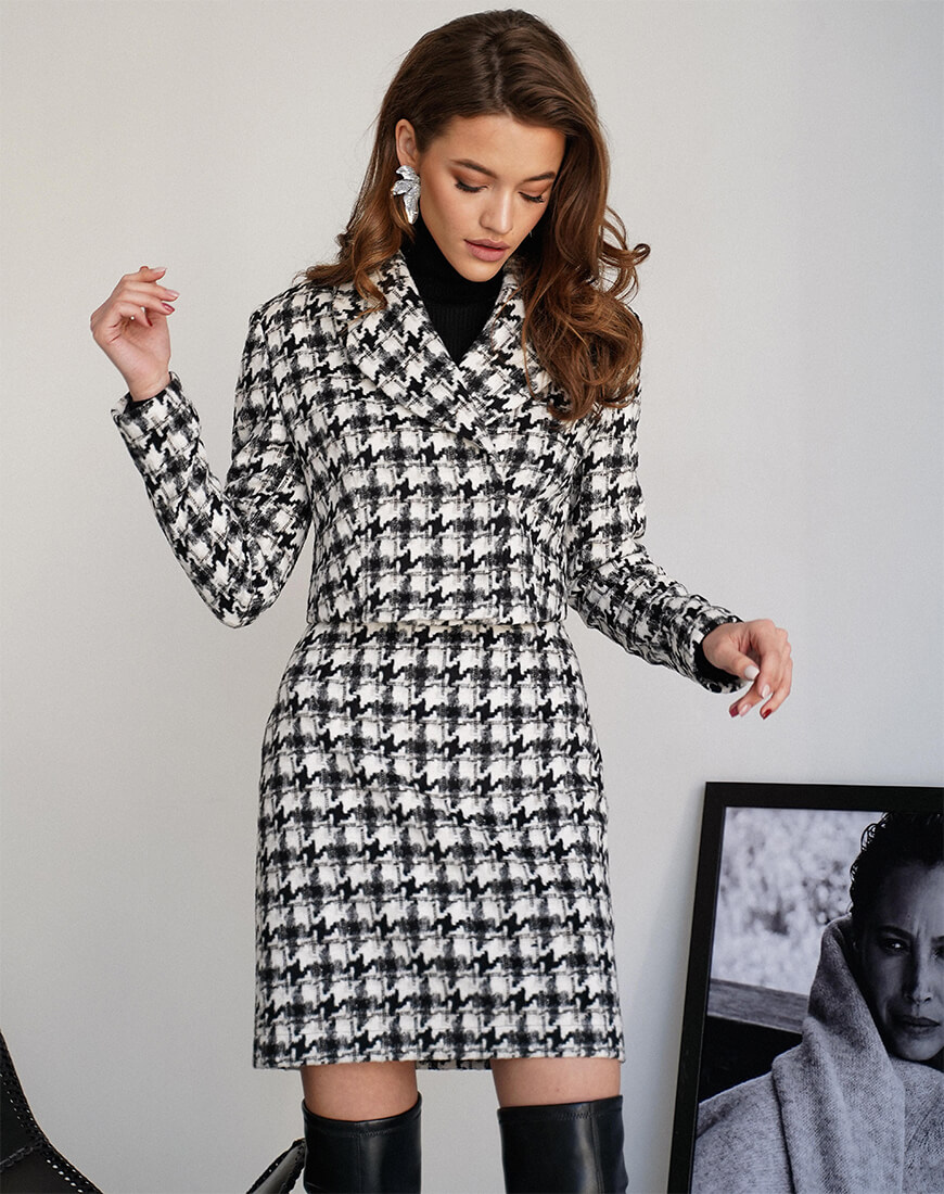 Вовняний костюм, що складається з укороченого жакета і спідниці. Жакет застібається на металеві кнопки, англійський воріт. Спідниця застібається ззаду на потаємну блискавку. Костюм виконаний на віскозній підкладці.