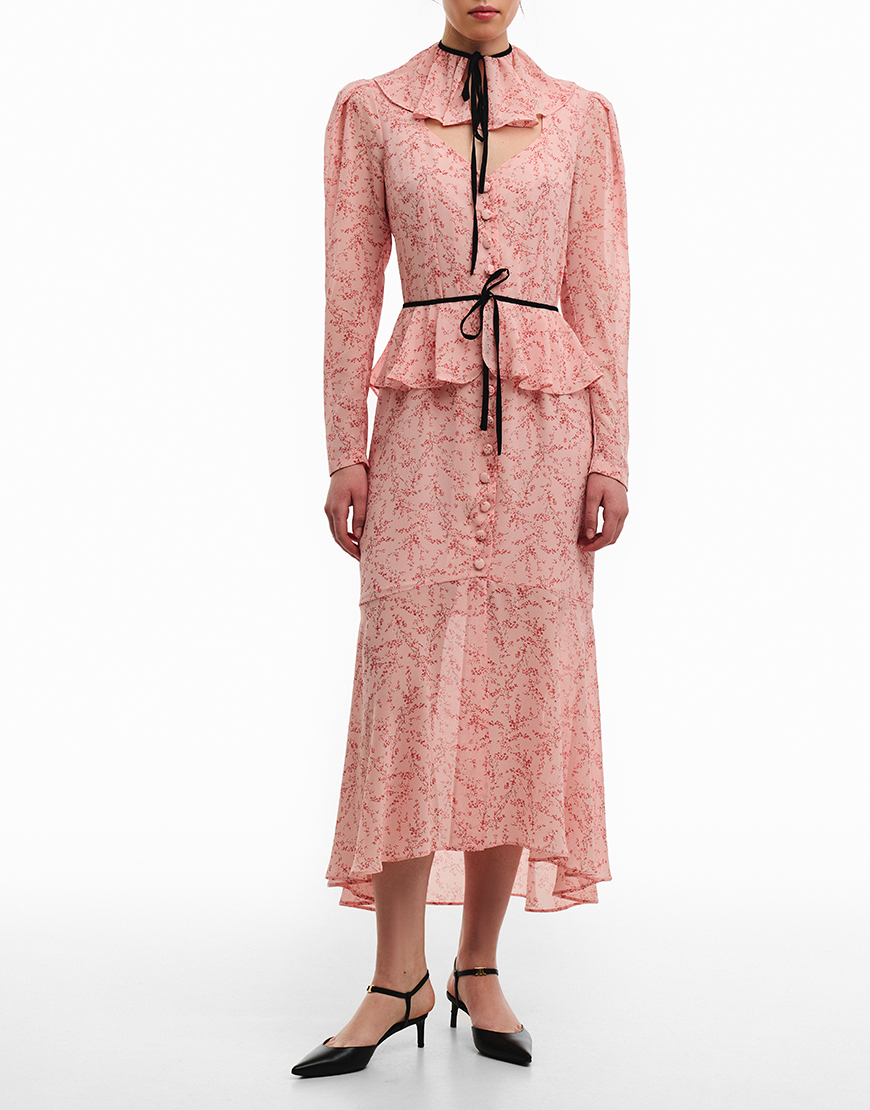 Сукня-міді з розкішного віскозного шифону. Сукня виконана на підкладці. Фігурний виріз по ліфу надає сукні особливої витонченості. Пояс та комір у комплекті. Преміальна технологія виконання з усіма закритими швами. Довжина сукні 130 см. Сукня виконана з делікатного шифону, який не містить еластану. Саме тому, рекомендуємо обирати розмір, який буде вільний по вашій фігурі.