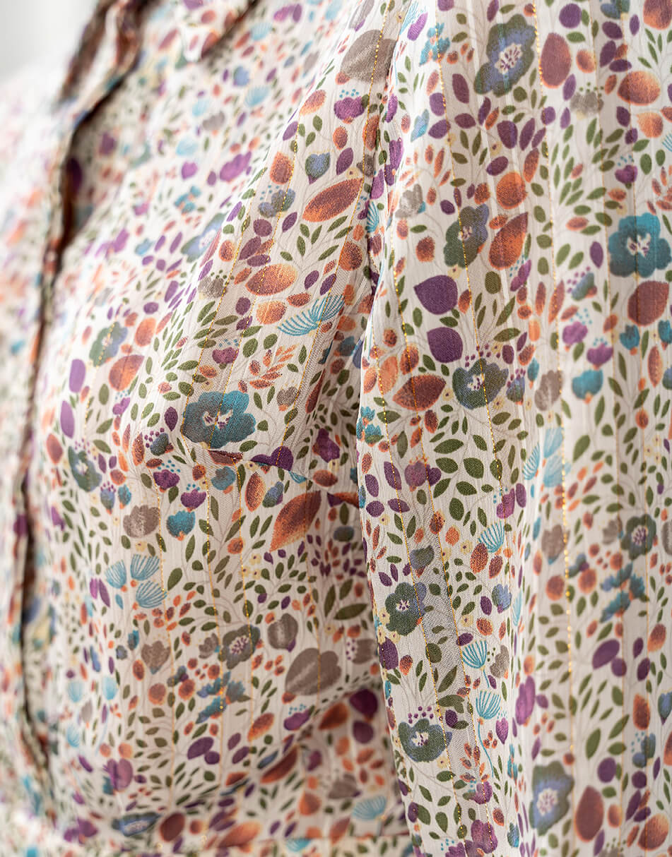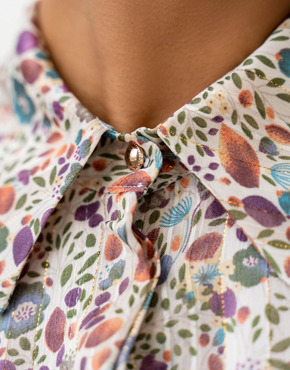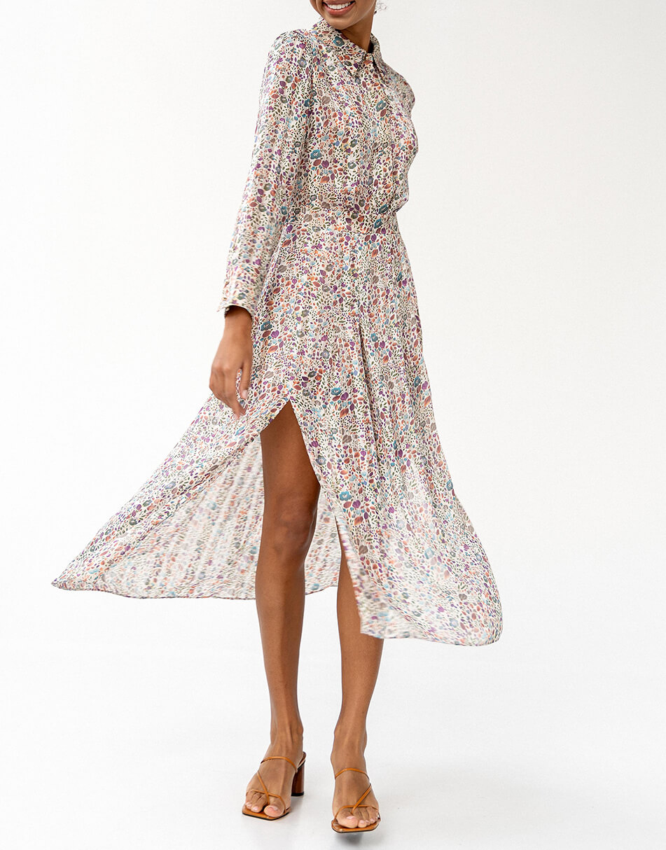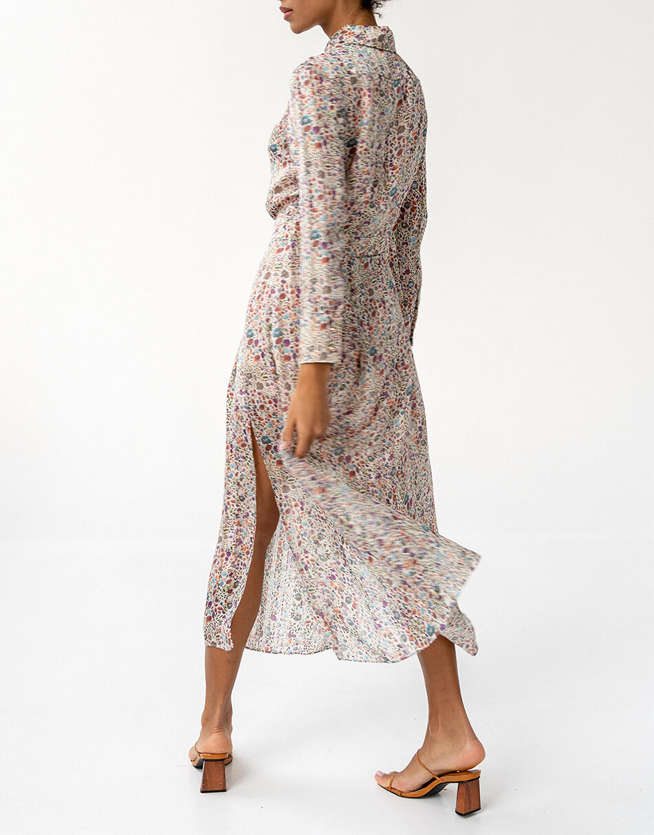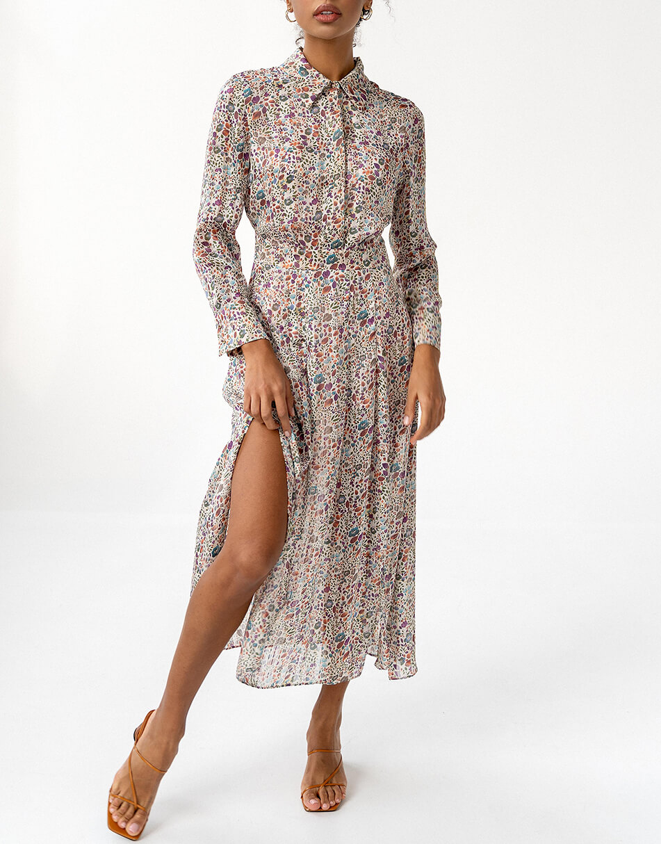 Легка, шифонова сукня в оригінальному принті. Подовжена спідниця з розрізами і легка тканина створюють неймовірно струмливий силует. Сукня виконана на підкладці і застібається збоку на потаємну блискавку. Також, спереду сукня застібається на декоративні ґудзики.