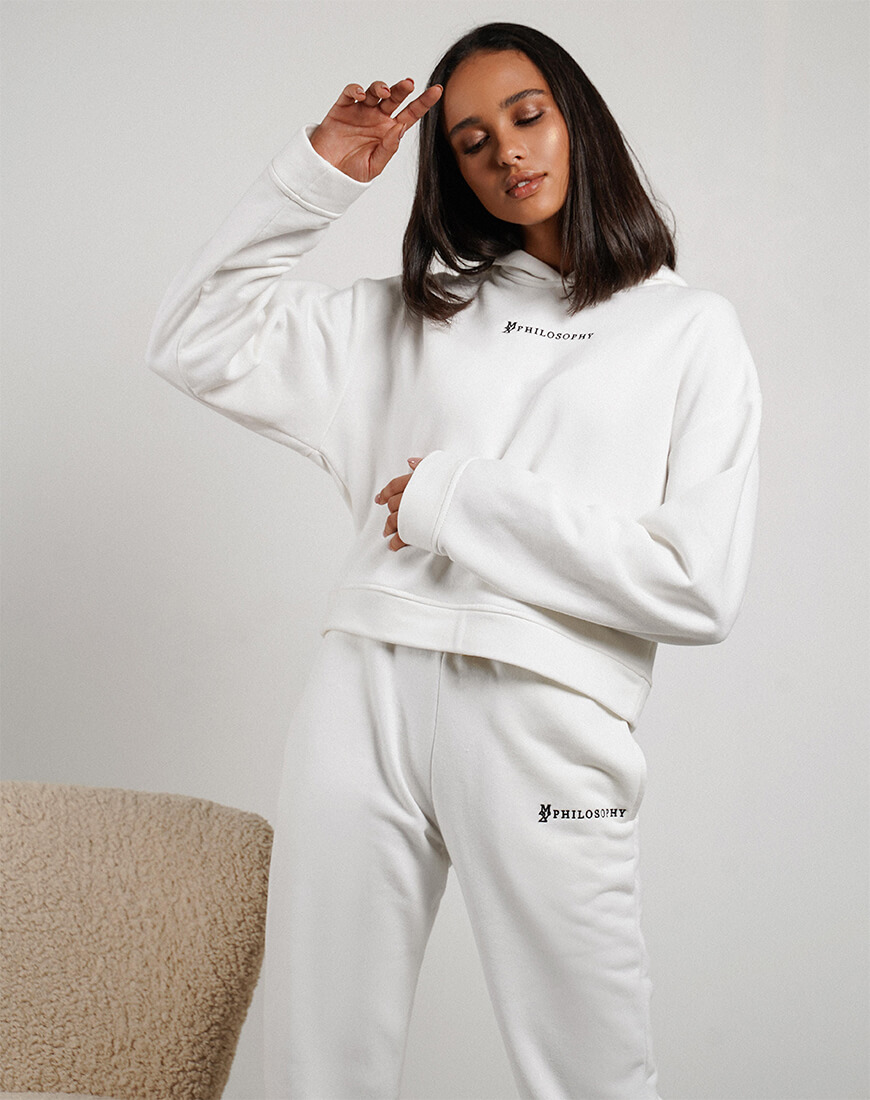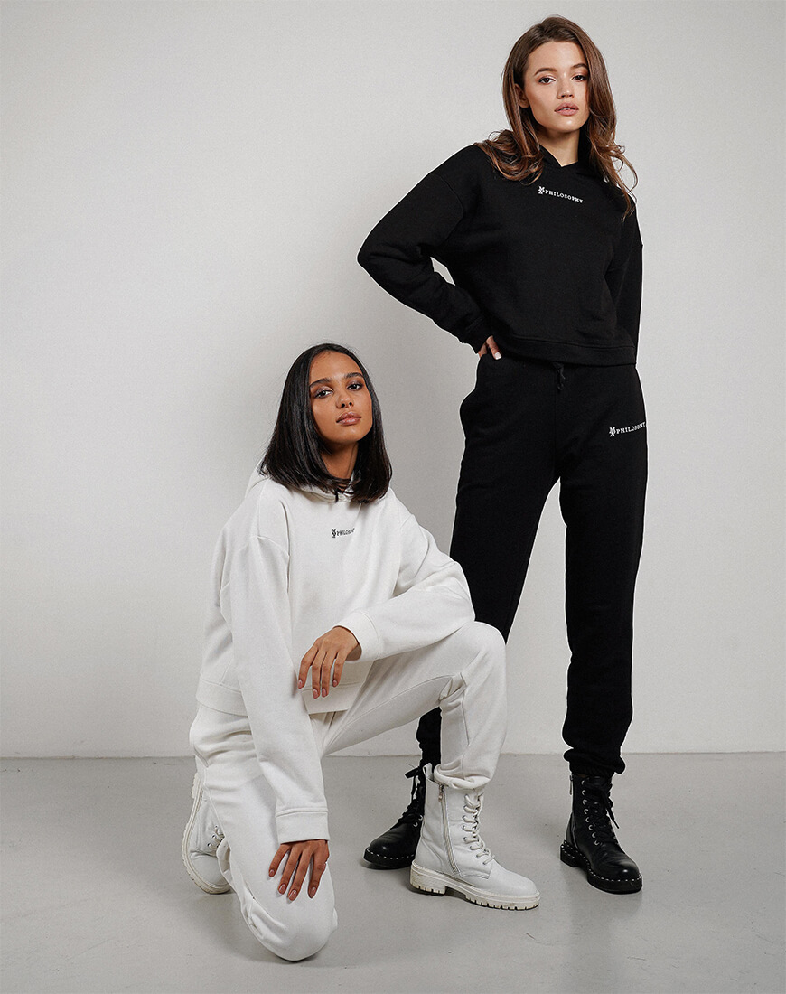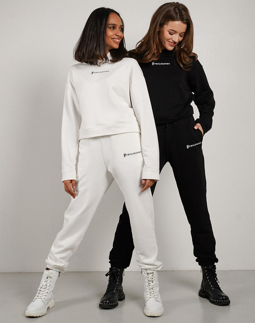 Зручний повсякденний костюм зі щільної бавовни. Костюм складається з об’ємного, укороченого худі та об’ємних штанів з високою лінією талії і кишенями з боків. Костюм декорований фірмовою вишивкою.