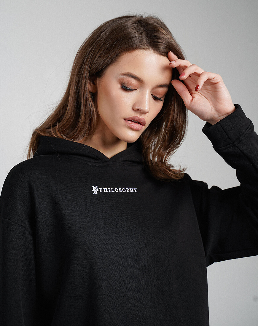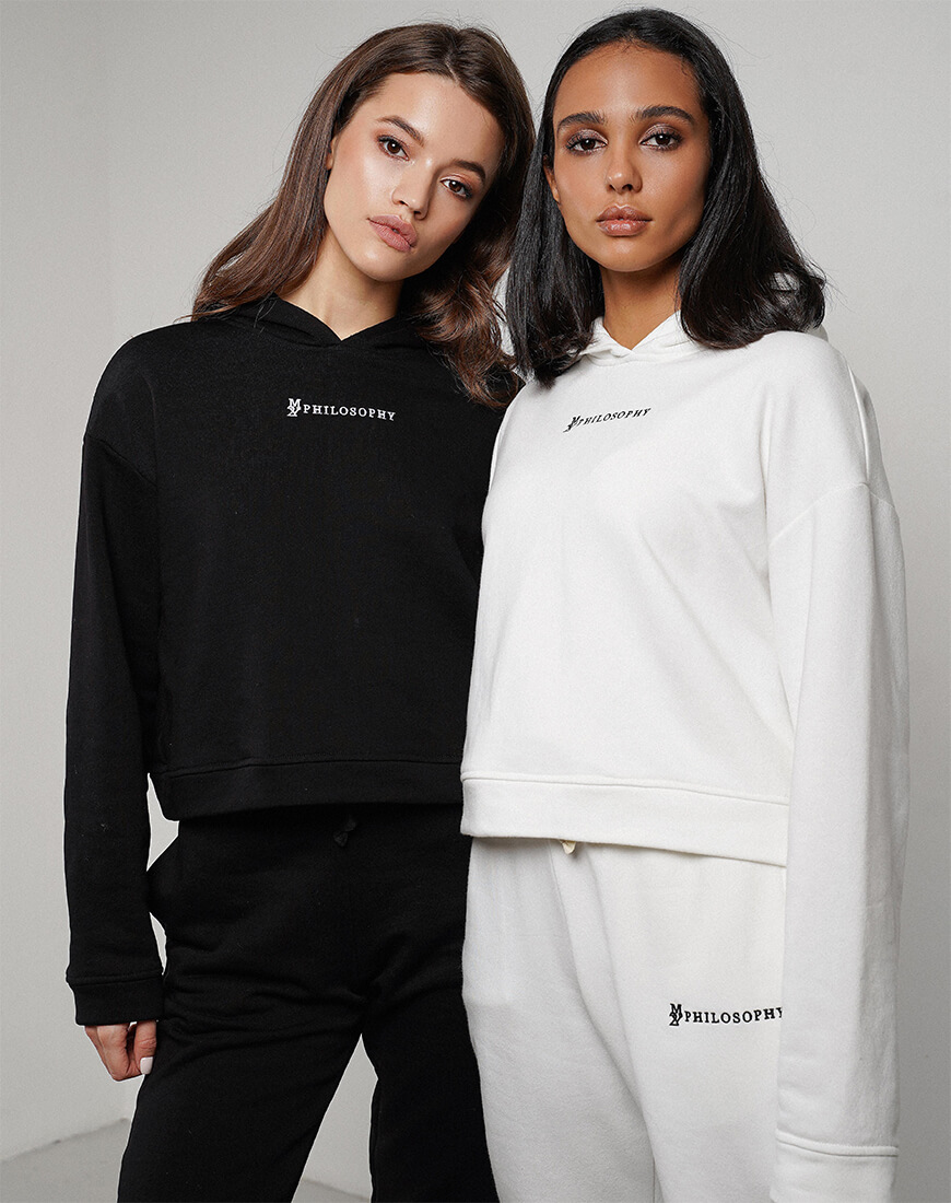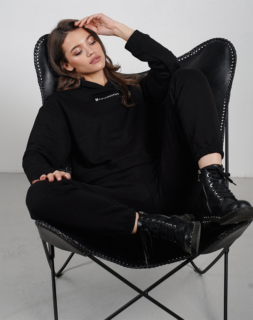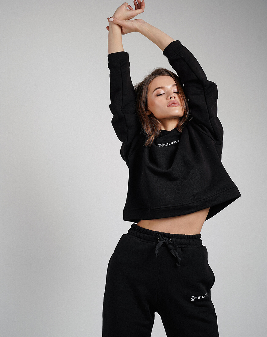 Зручний повсякденний костюм зі щільної бавовни. Костюм складається з об’ємного, укороченого худі та об’ємних штанів з високою лінією талії і кишенями з боків. Костюм декорований фірмовою вишивкою.