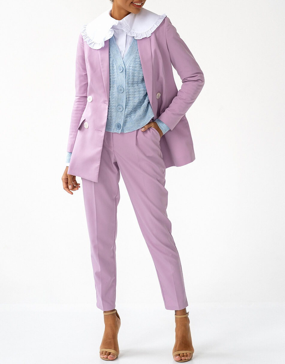 Розкішний костюм із м’якої костюмної тканини. Подовжений піджак прямого крою повністю на підкладці. Штани із завищеною талією, прямого крою, застібаються на потаємну блискавку та гачок. Костюм ідеально поєднується як із взуттям на підборах, так і на плоскій підошві.