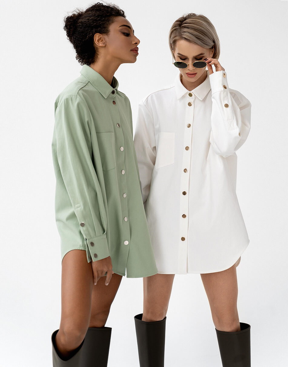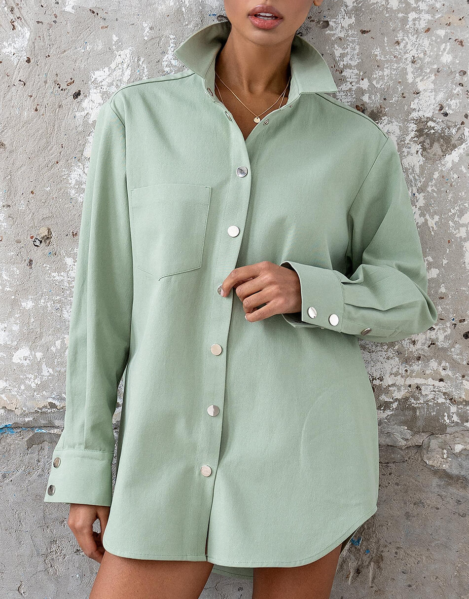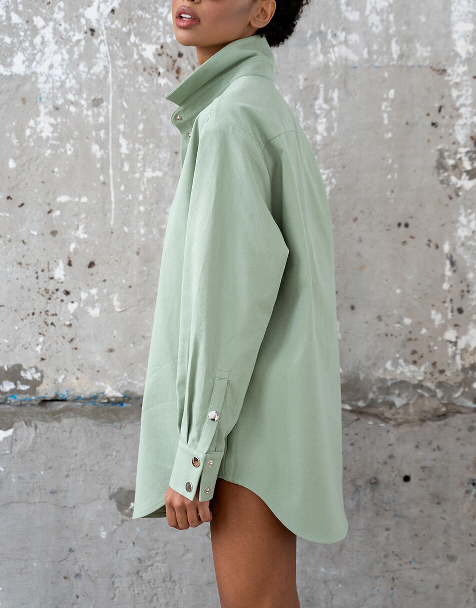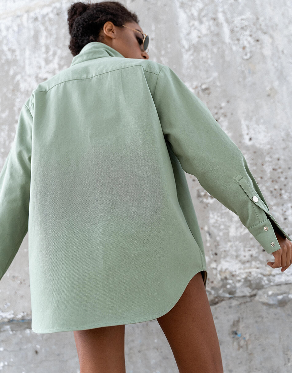 Джинсова сорочка об’ємного крою з накладною кишенею. Застібається на металеві кнопки. Довжина виробу по спинці 80 див.