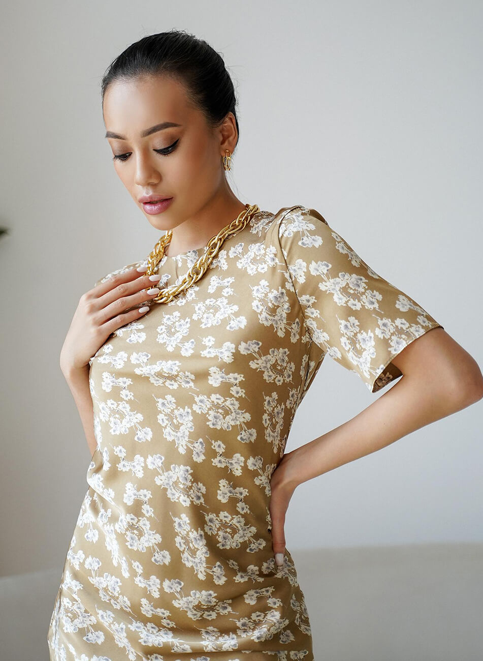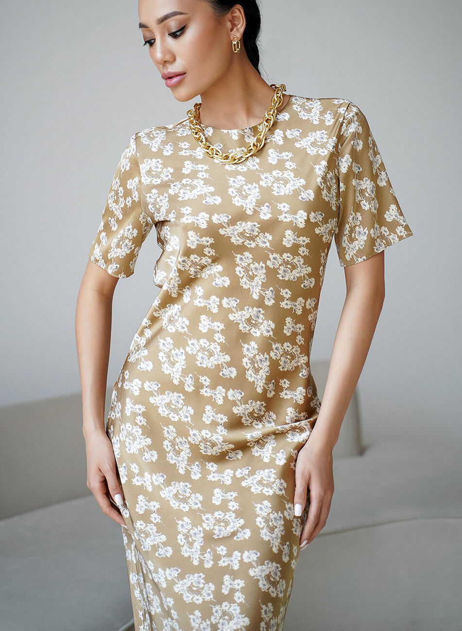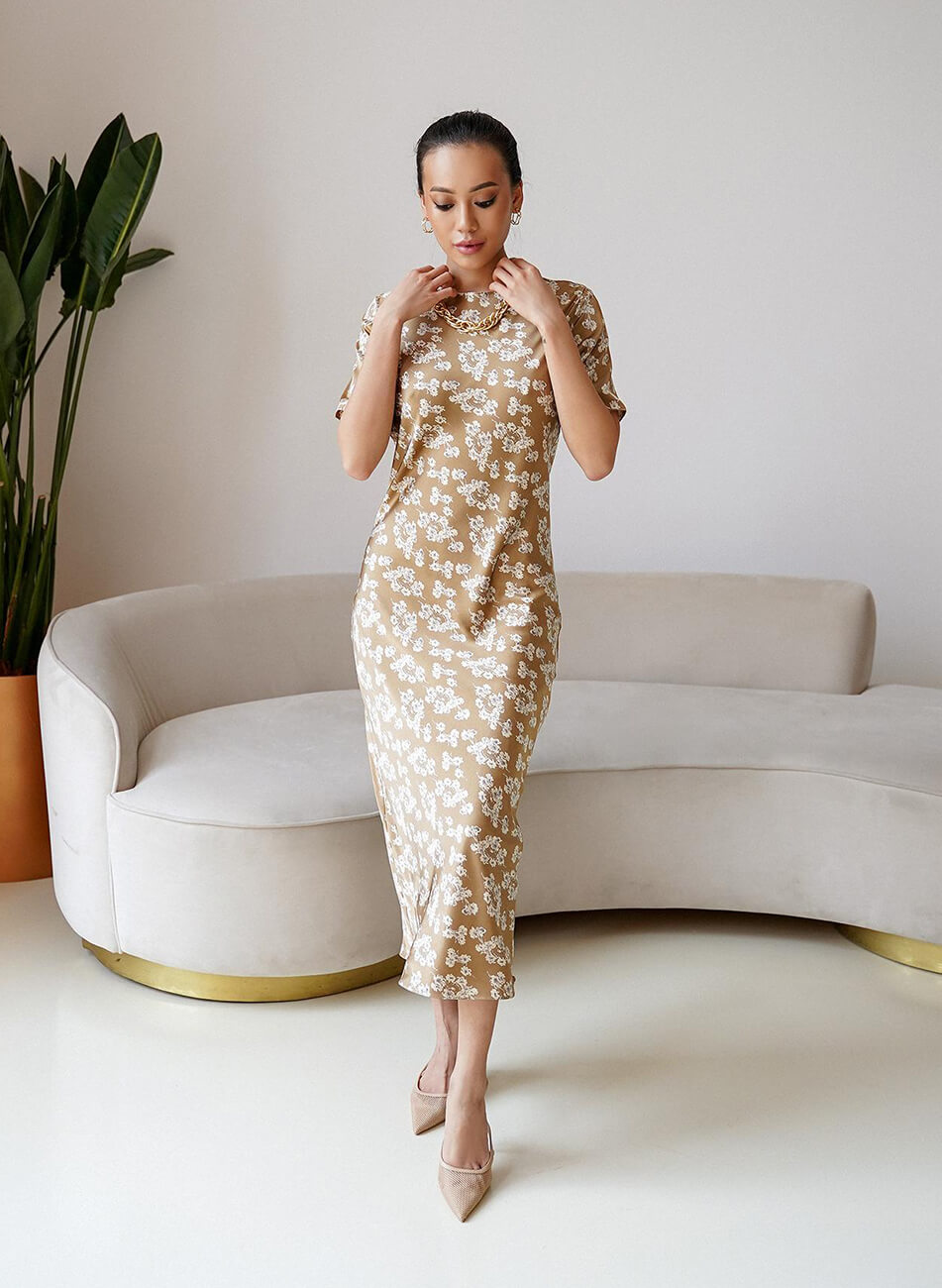 Оригінальна сукня з ніжної шовкової тканини. Невагома тканина ідеально підходить для літньої спеки. Жодних зовнішніх швів. Сукня кроєна по-косій, що забезпечує ідеальне, м’яке прилягання по фігурі.