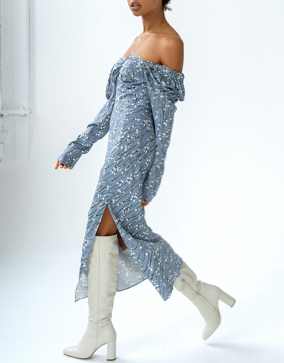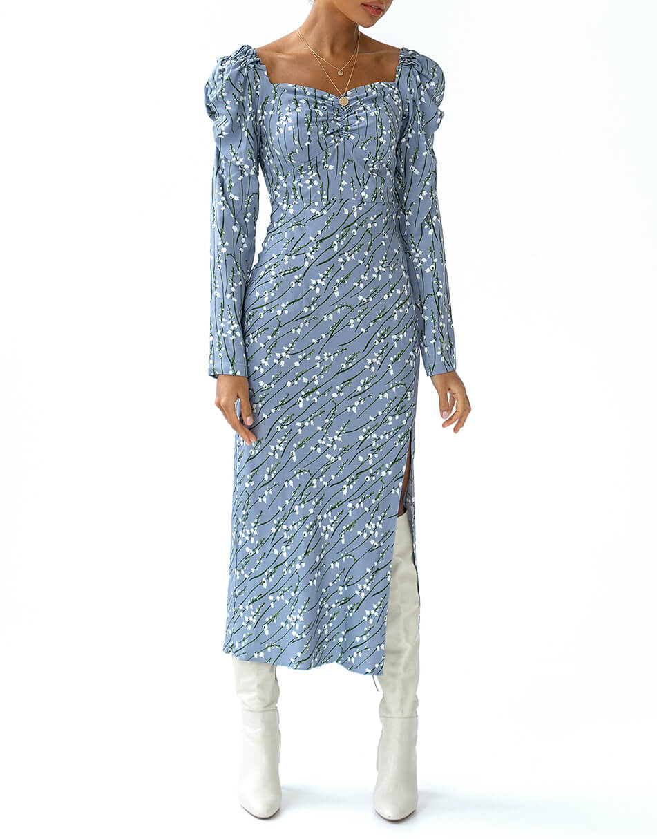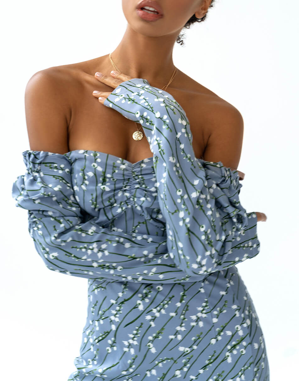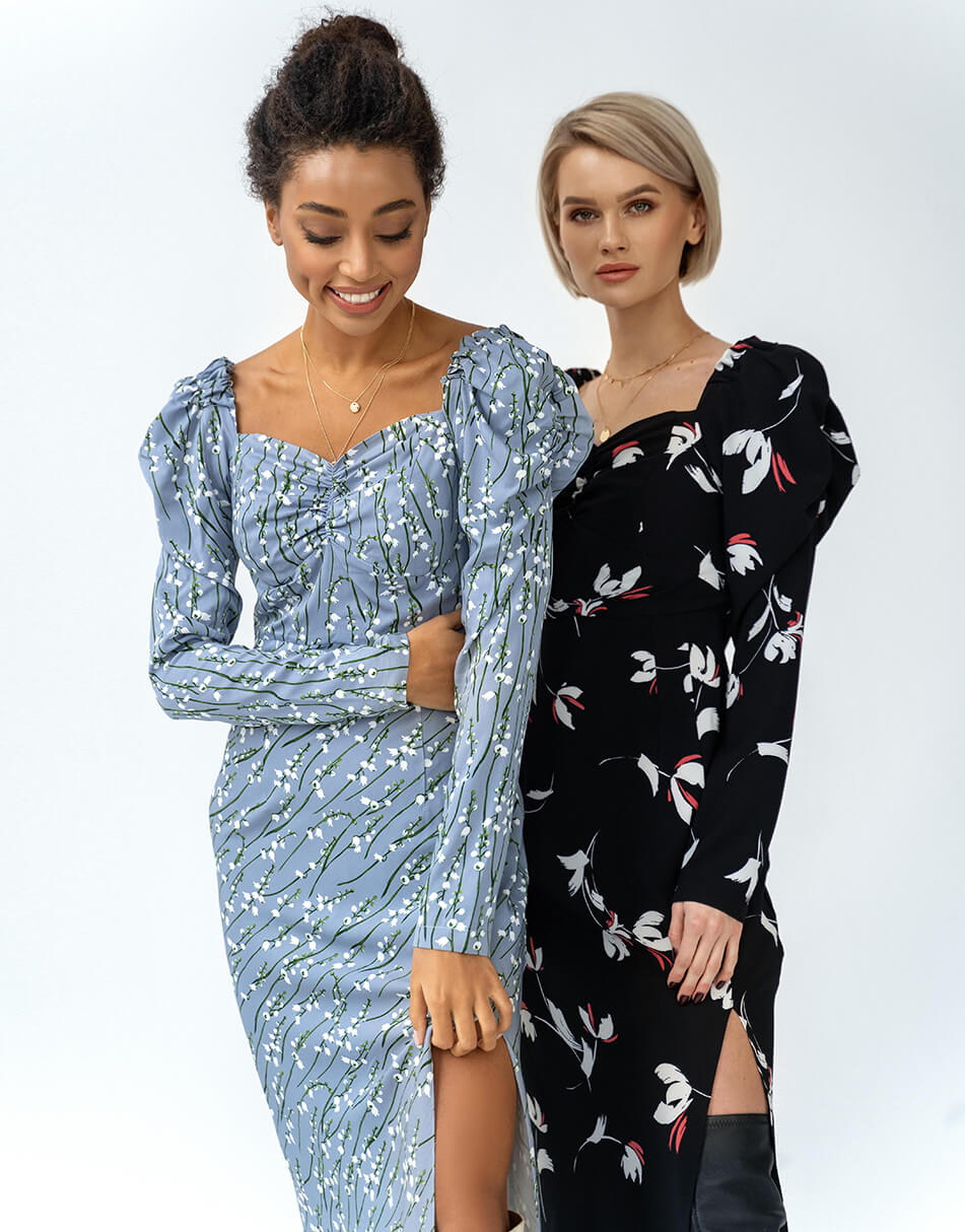 Силуетна сукня з рукавами-ліхтариками і яскравим принтом. Відрізна лінія під грудьми. Верх сукні виконано на підкладці. Застібається ззаду на потаємну блискавку.
