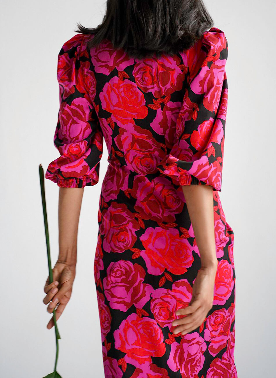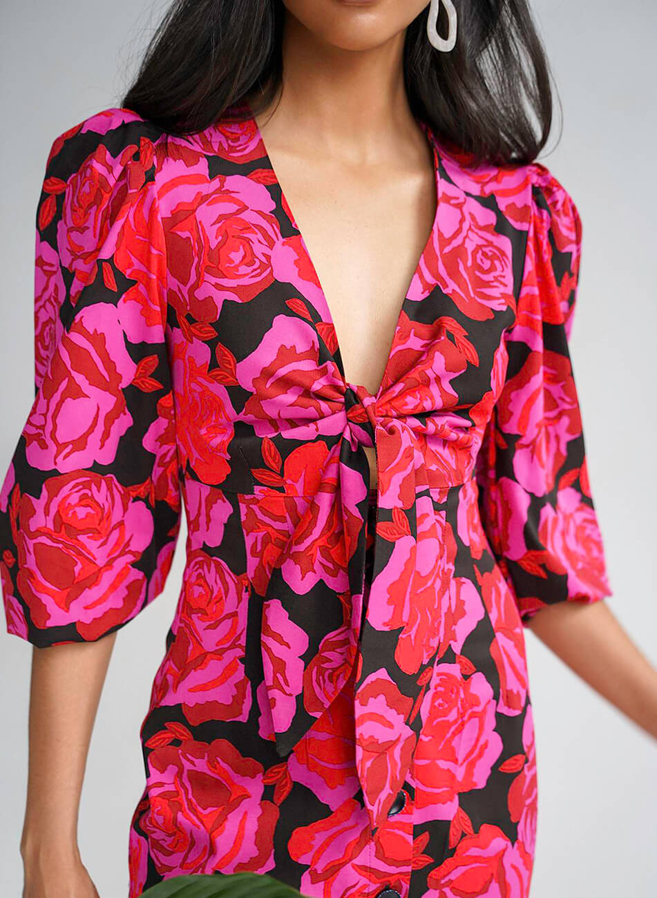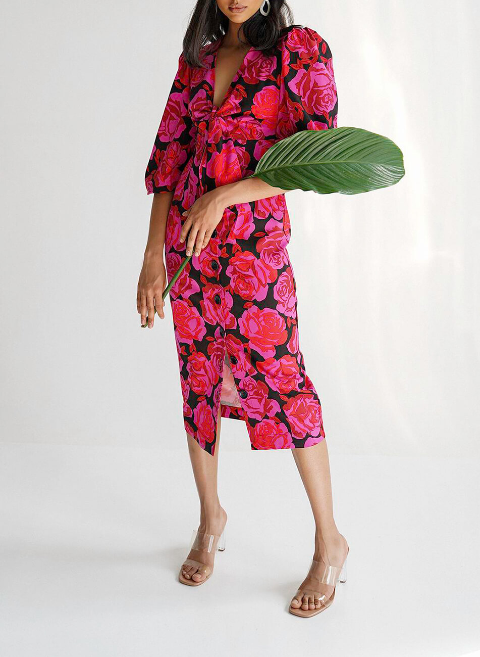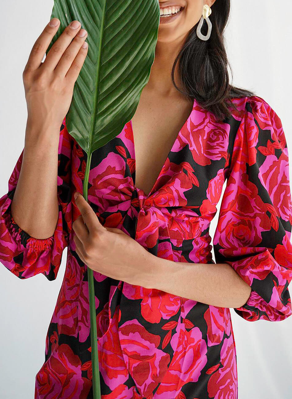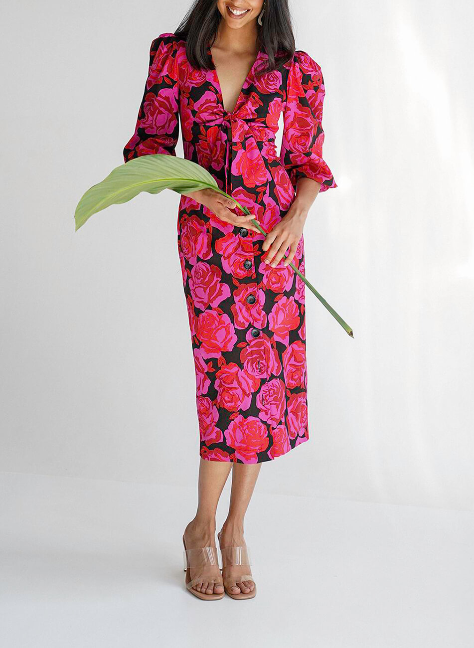 Легка, романтична сукня оригінального крою з об’ємними рукавами. Невагома тканина ідеально підходить для літньої спеки. Сукня застібається спереду на ґудзики, а також зав’язується на бант. Довжина по спинці 121 см.