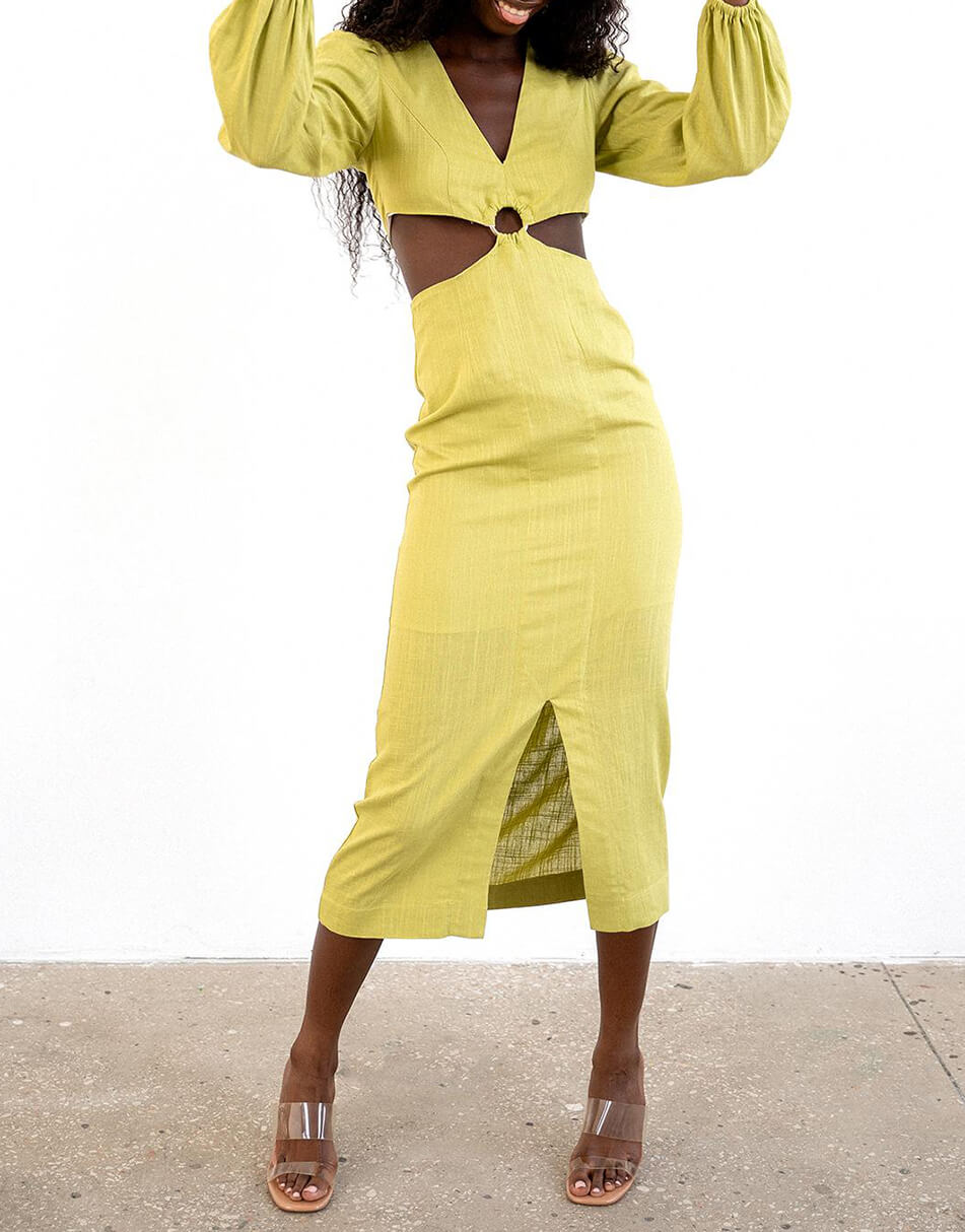 Лляна сукня міді довжини з фігурними вирізами по лінії талії і розрізом по переду спідниці. Застібається ззаду на потаємні блискавки. Об’ємні рукави з гумкою на манжеті. Сукня виконана на підкладці.