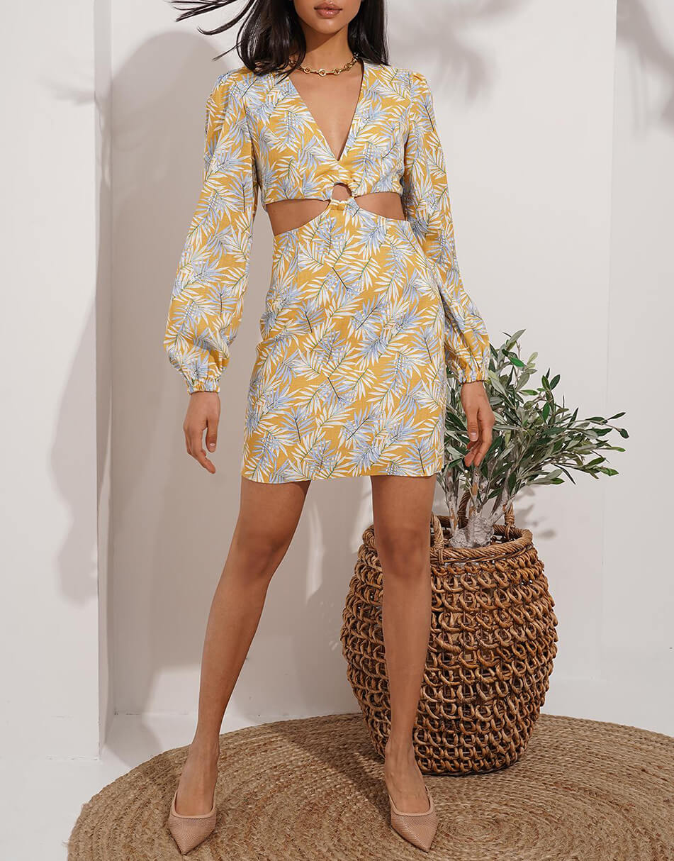 Лляна сукня міні довжини з фігурними вирізами по лінії талії та розрізом на передній частині спідниці. Застібається ззаду на потаємні молнії. Об’ємні рукава з резинкою на манжеті. Сукня виконана на підкладці.