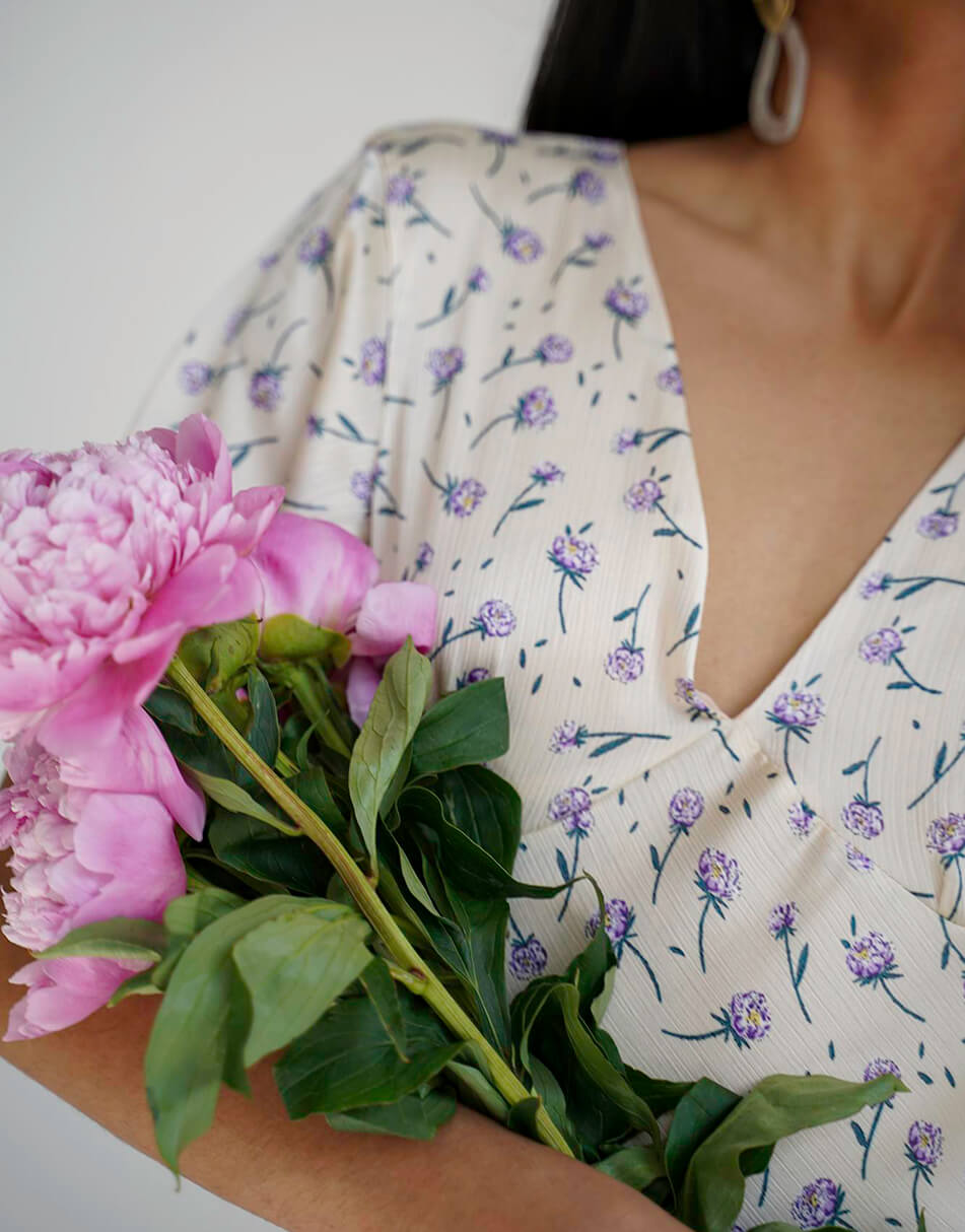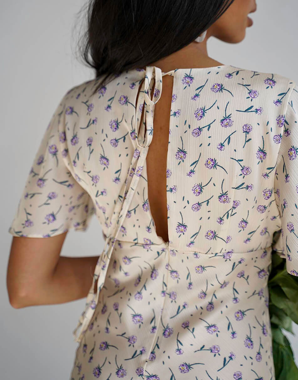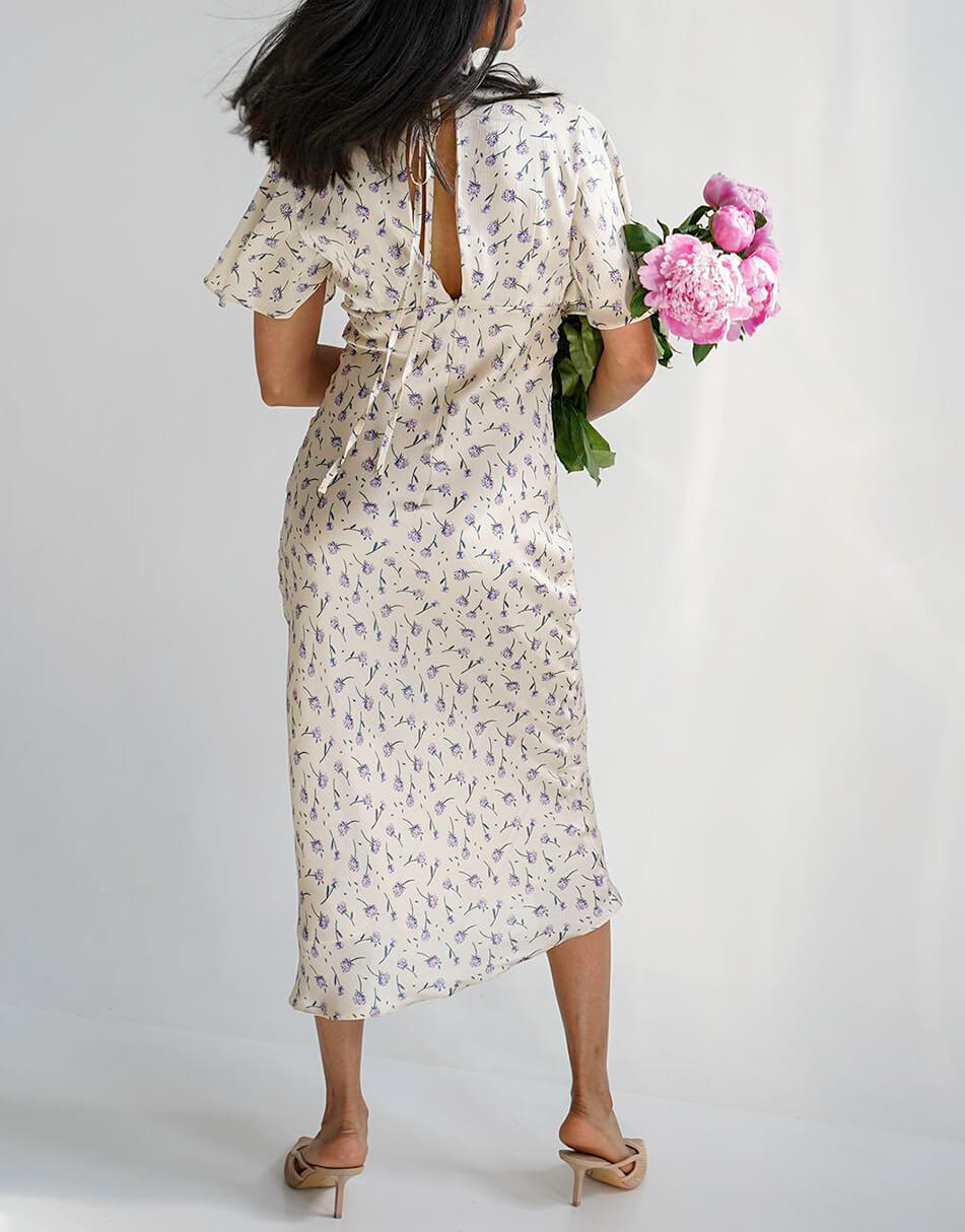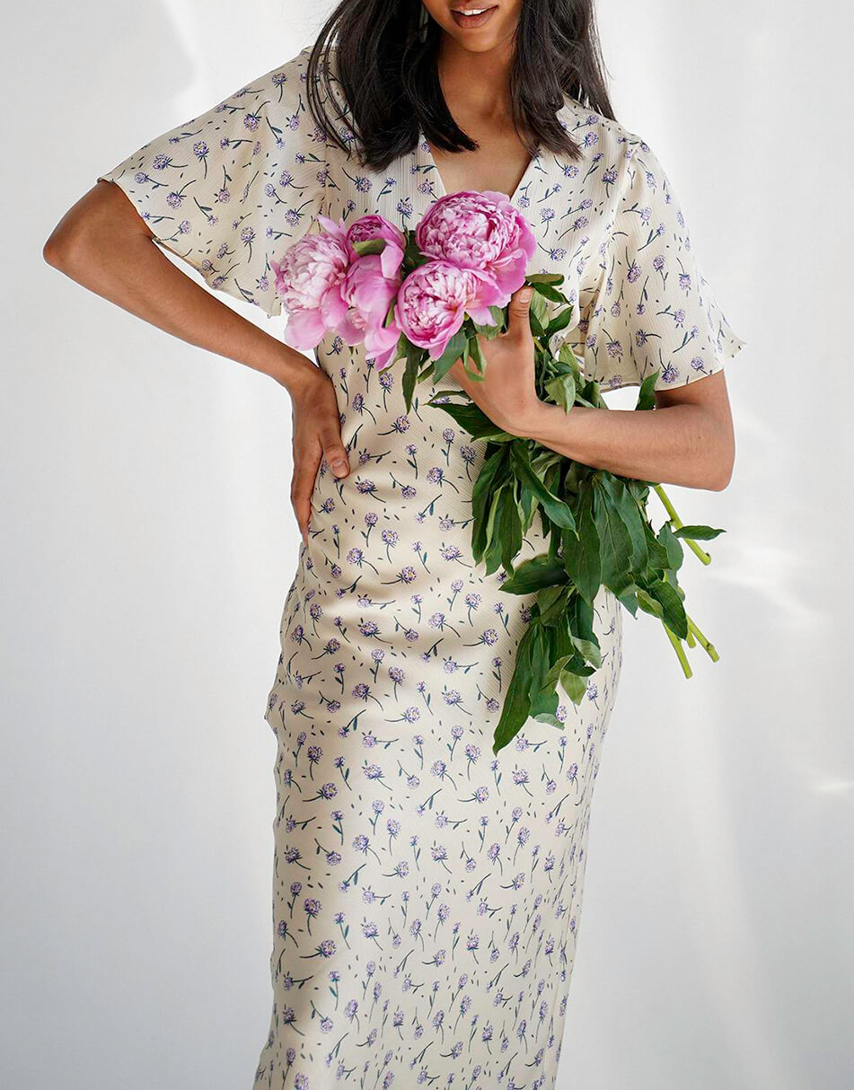 Силуетна сукня зі струмливими рукавами-метеликами. Відрізна лінія з невеликими складками під грудьми. Тканина фактурний шифон квіткового принта. Сукня виконана на підкладці і декорована розрізом по спинці. Застібається ззаду на потаємну блискавку.