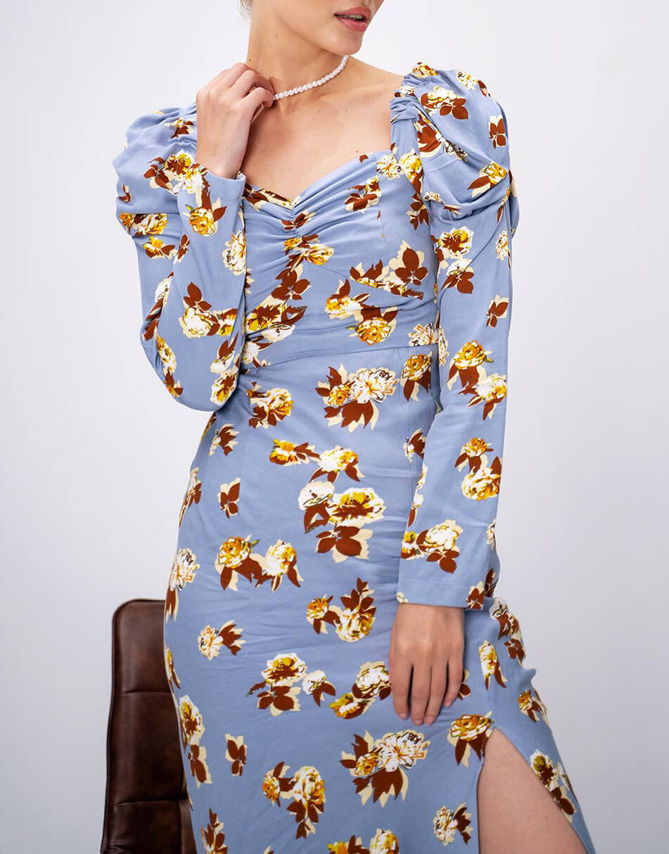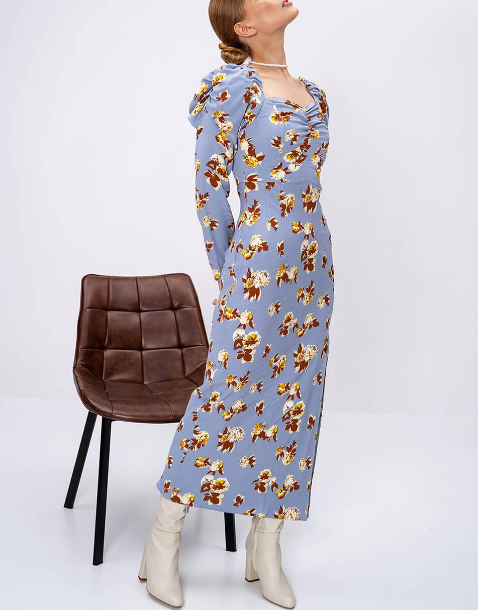 Силуетна сукня з рукавами-ліхтариками та яскравим принтом. Відрізна лінія під грудьми. Верх сукні виконаний на підкладці. Застібається ззаду на таємну блискавку.