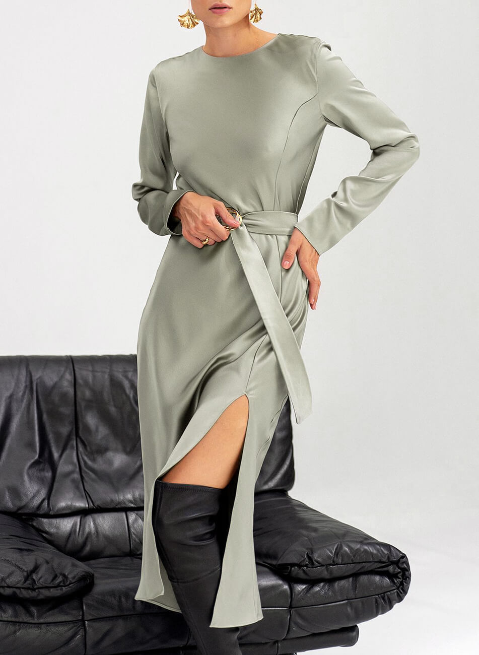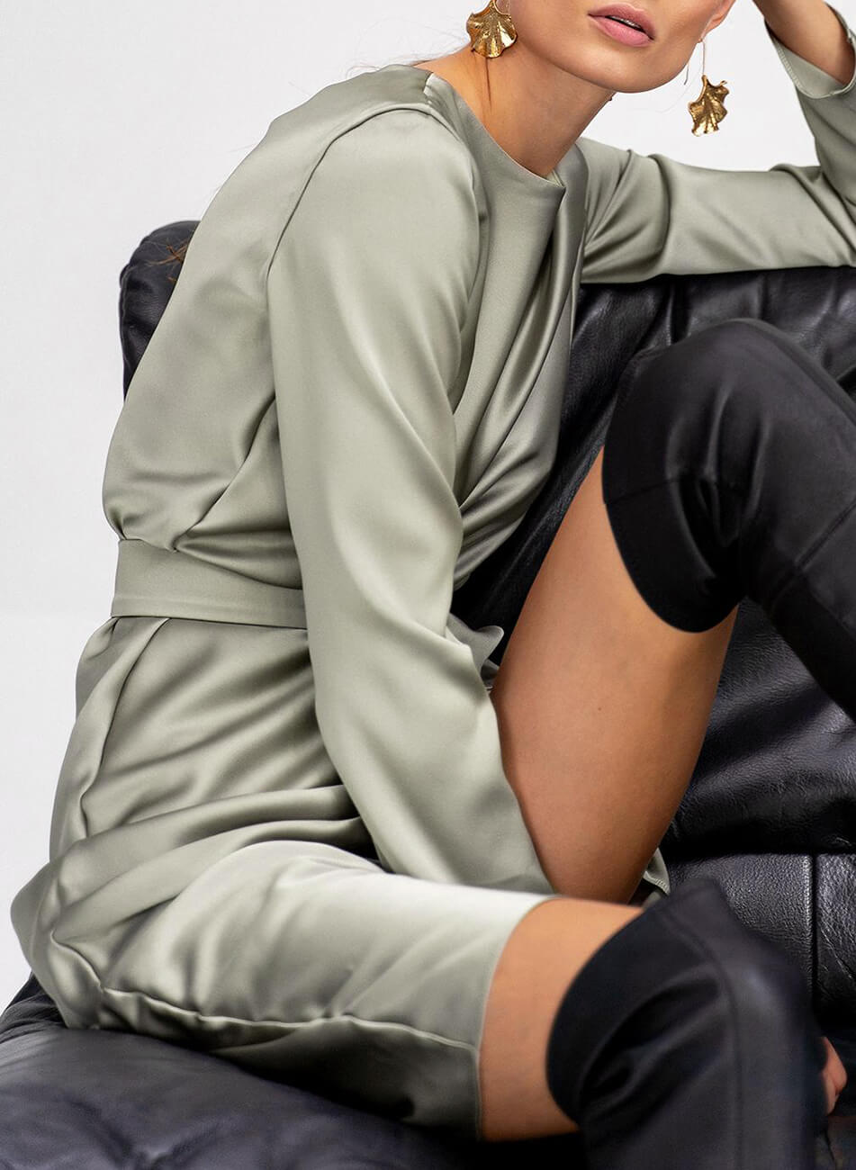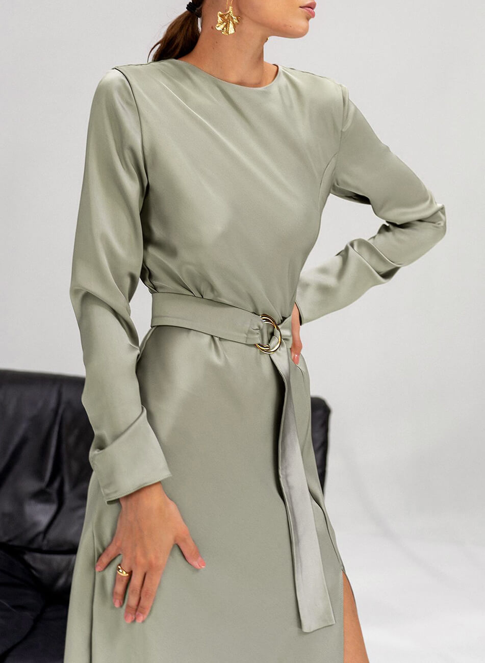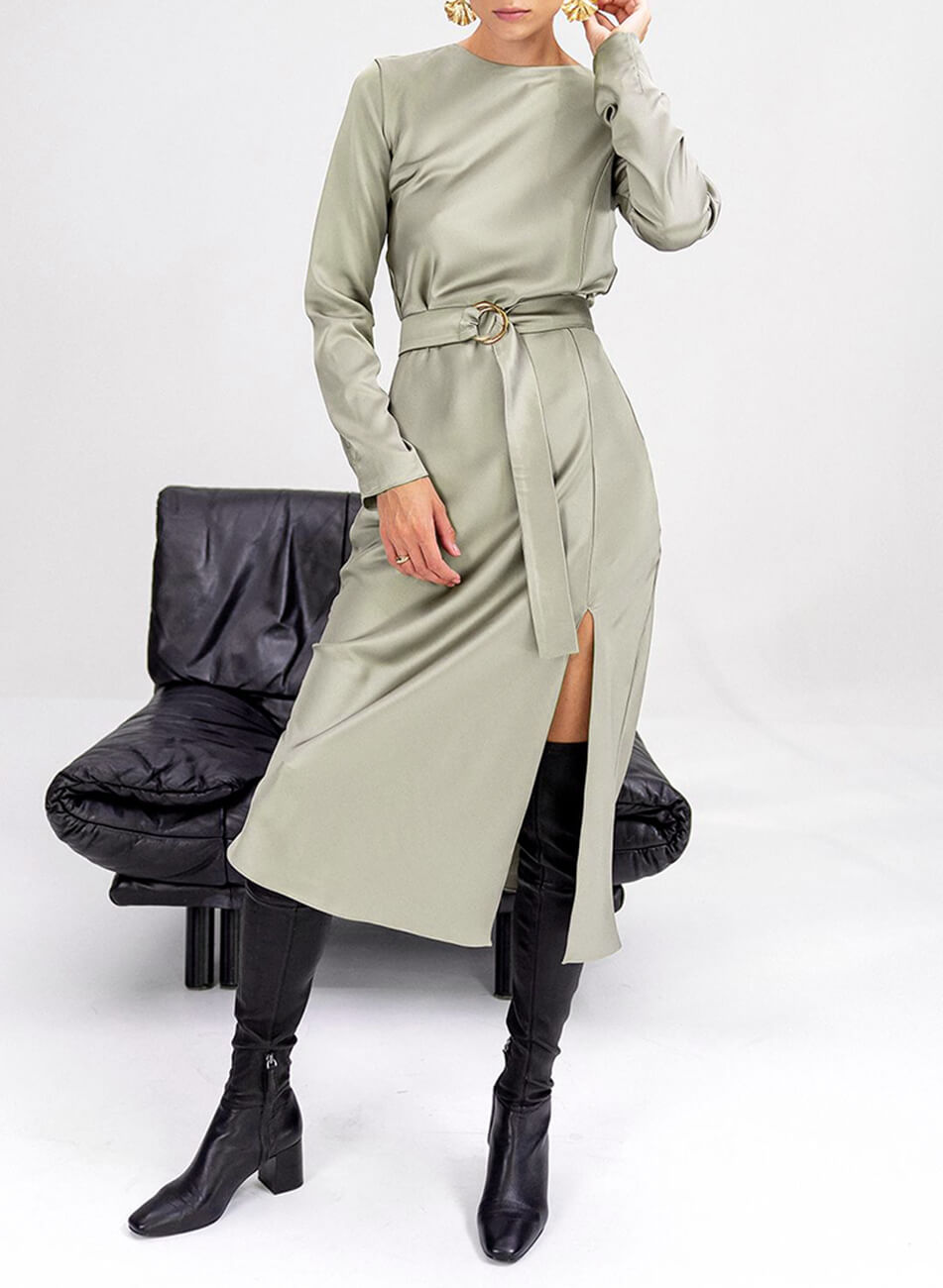 Оригінальна сукня з ніжної шовковистої тканини. Сукня крою по-косій, що забезпечує ідеальне, м’яке прилягання по фігурі. Сукня виконана на підкладці та декорована розрізом по нозі. Застібається ззаду на гудзик.