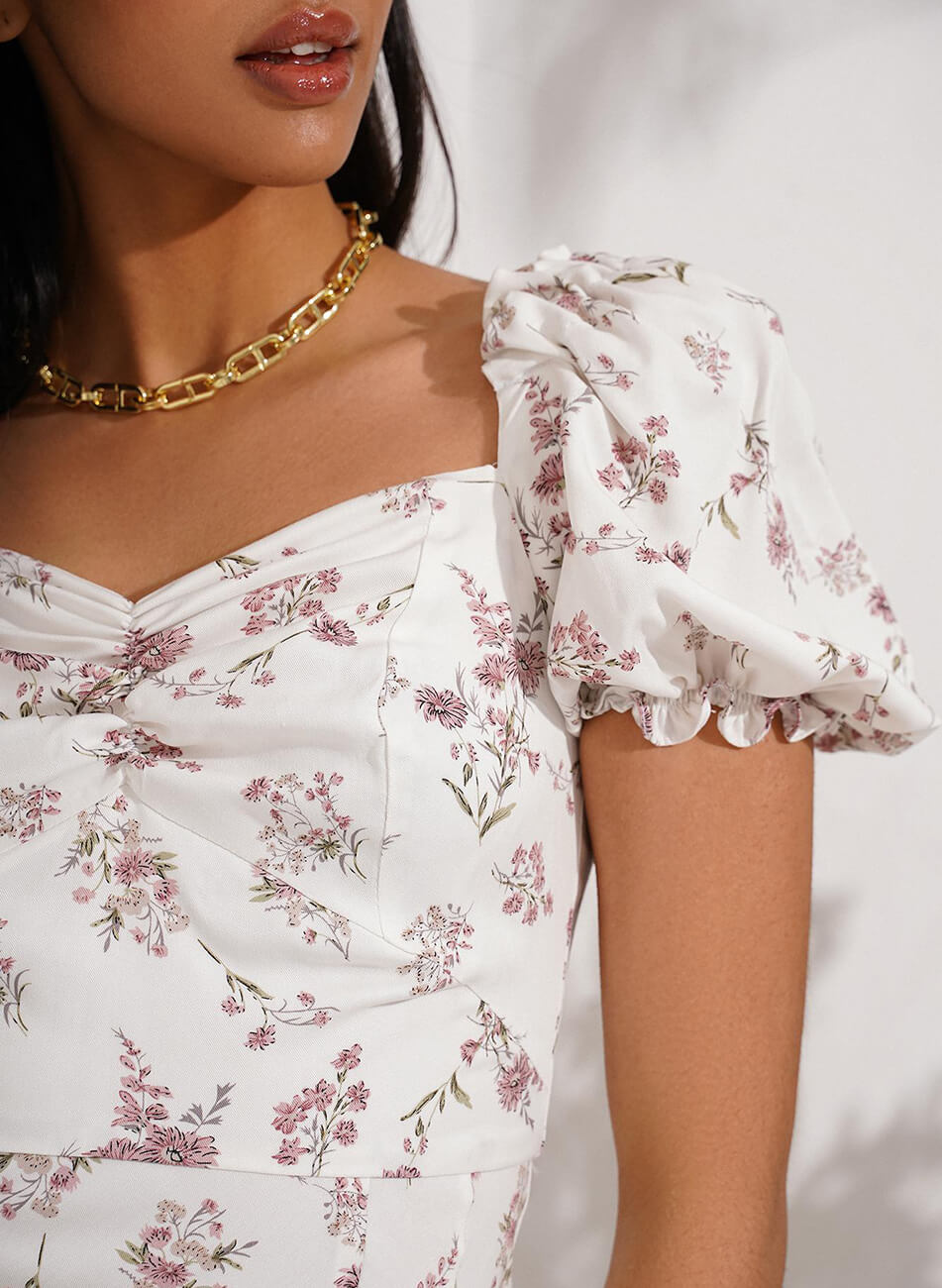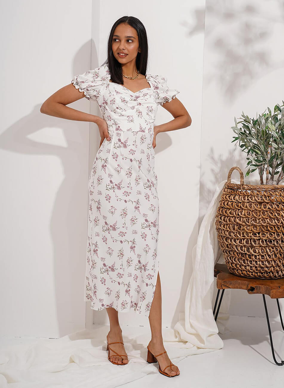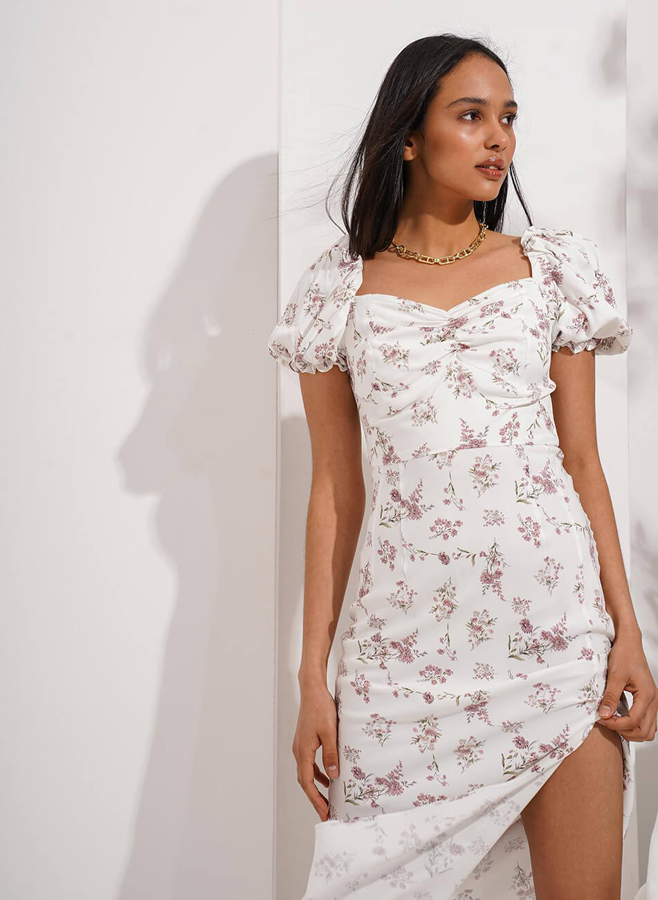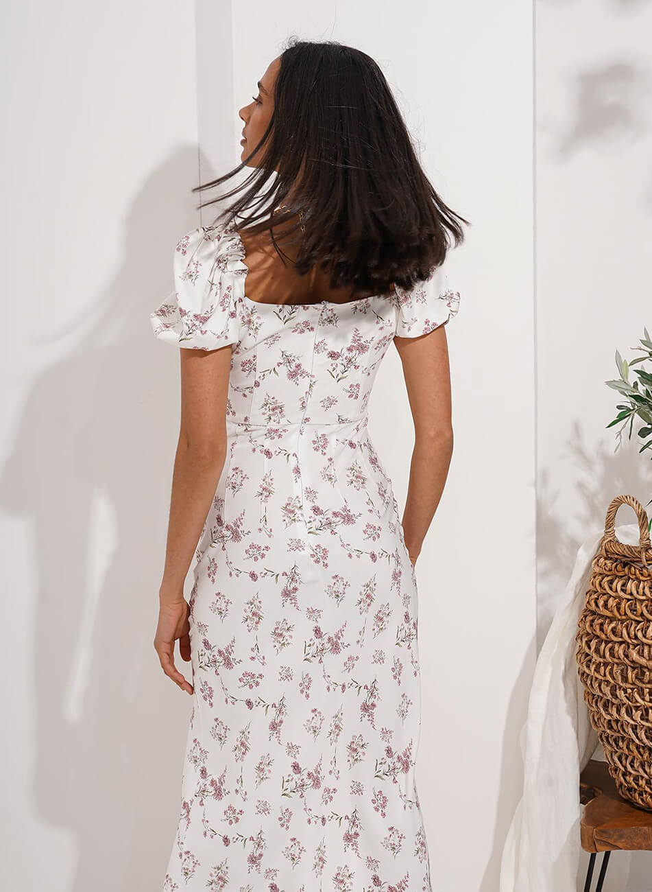 Силуетна сукня з рукавами-ліхтариками і яскравим принтом. Відрізна лінія під грудьми. Верх сукні виконано на підкладці. Застібається ззаду на потаємну блискавку.